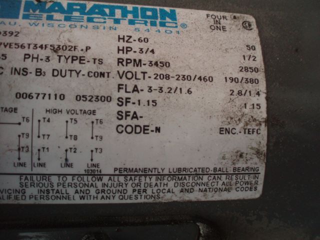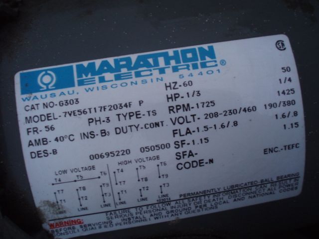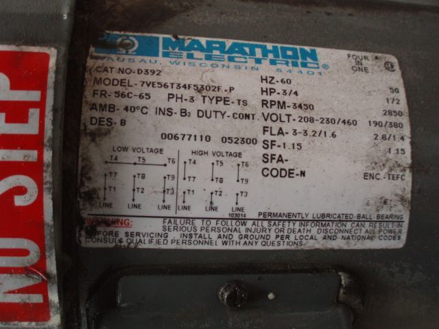 - Si hay varios motores, descripciones de motores frente a especificaciones: (1) 0.75 hp Marathon Electric Motor, and (1) 0.33 hp Marathon Electri