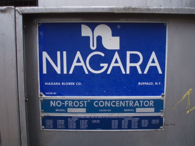 2000 Concentrador “No-Frost”® de Niagara Blower Company. Modelo: A40E. Número de serie 00-12983. (1) Motor eléctrico Marathon, 0,75 hp, 3450 rpm, 208-230/460 V, 60 Hz, trifásico. (1) Motor eléctrico Marathon, 1/3 hp, 1725 rpm, 208-230/460 V, 60 Hz, trifásico. La tecnología No-Frost® ofrece deshumidificación por refrigeración y desecante líquido a base de glicol y es ideal para aplicaciones de procesamiento, envasado y almacenamiento donde se requieren condiciones consistentes y libres de escarcha. Las características incluyen: Inhibición permanente del 99,9 % de los patógenos transmitidos por el aire, absorción de humedad de la corriente de aire y un serpentín sanitario libre de escarcha. Entrada: (1) 1 pulg. de diámetro. Puerto. Salidas: (1) 1 pulg. de diámetro. puerto. Dimensiones totales: 5 pies de largo x 3 pies 5 pulgadas de ancho x 6 pies de alto (H15) (ACN560).