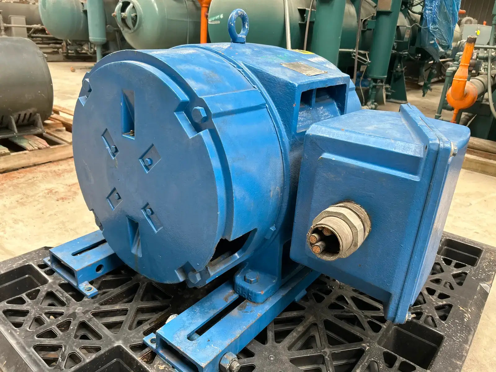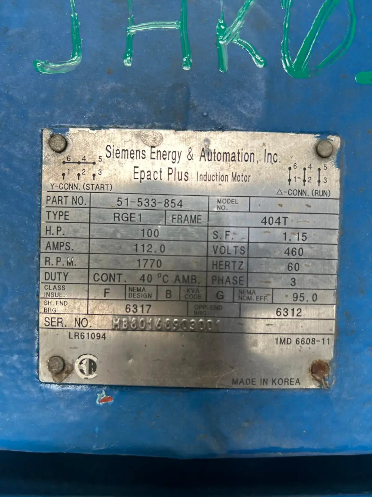 Motor de inducción Siemens Epact Plus. Tipo: RGE1. Número de serie: MB80168903001. Fuente de alimentación: HP: 100, Amperios: 112,0, RPM: 1770, Voltios: 460, Hz: 60, Fase: 3, Bastidor: 404T.