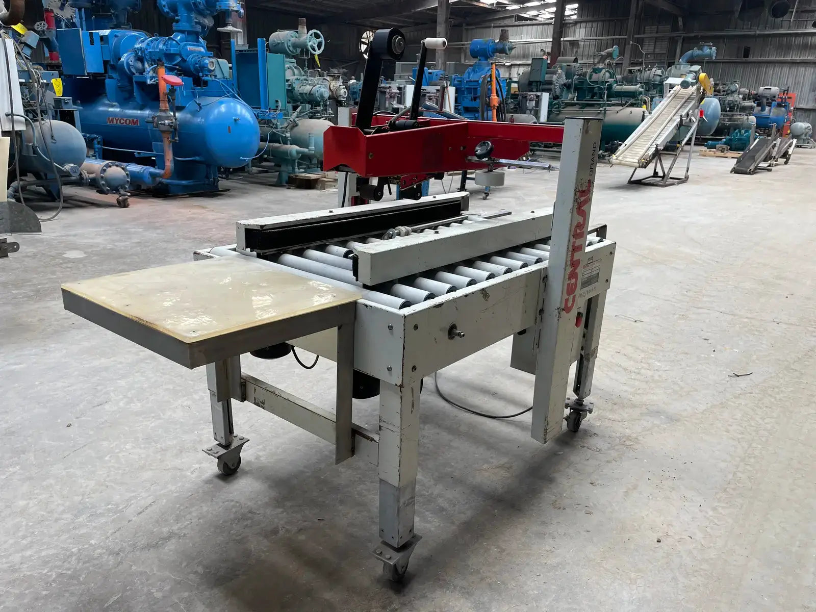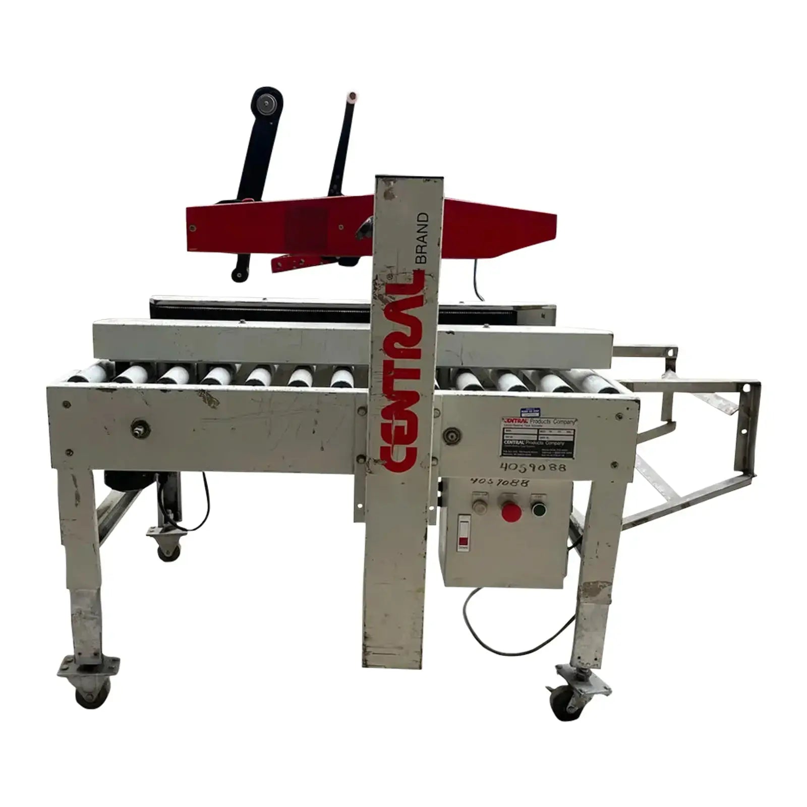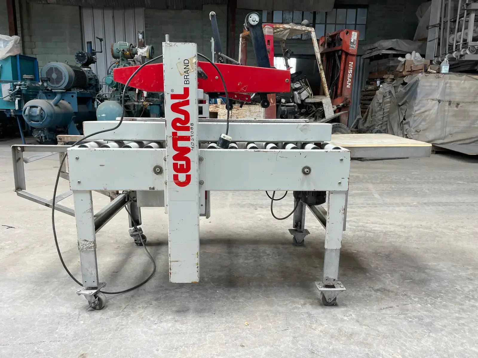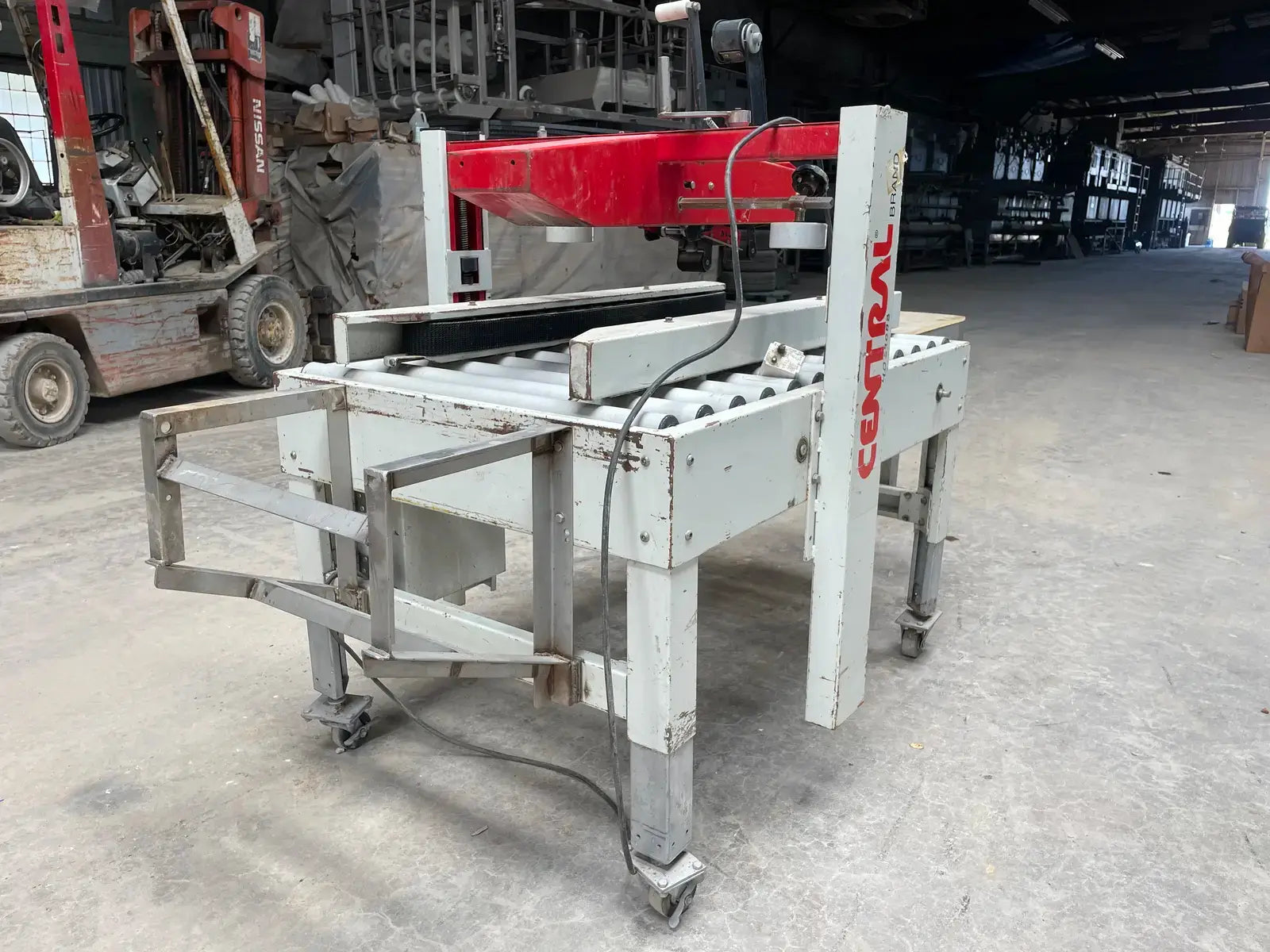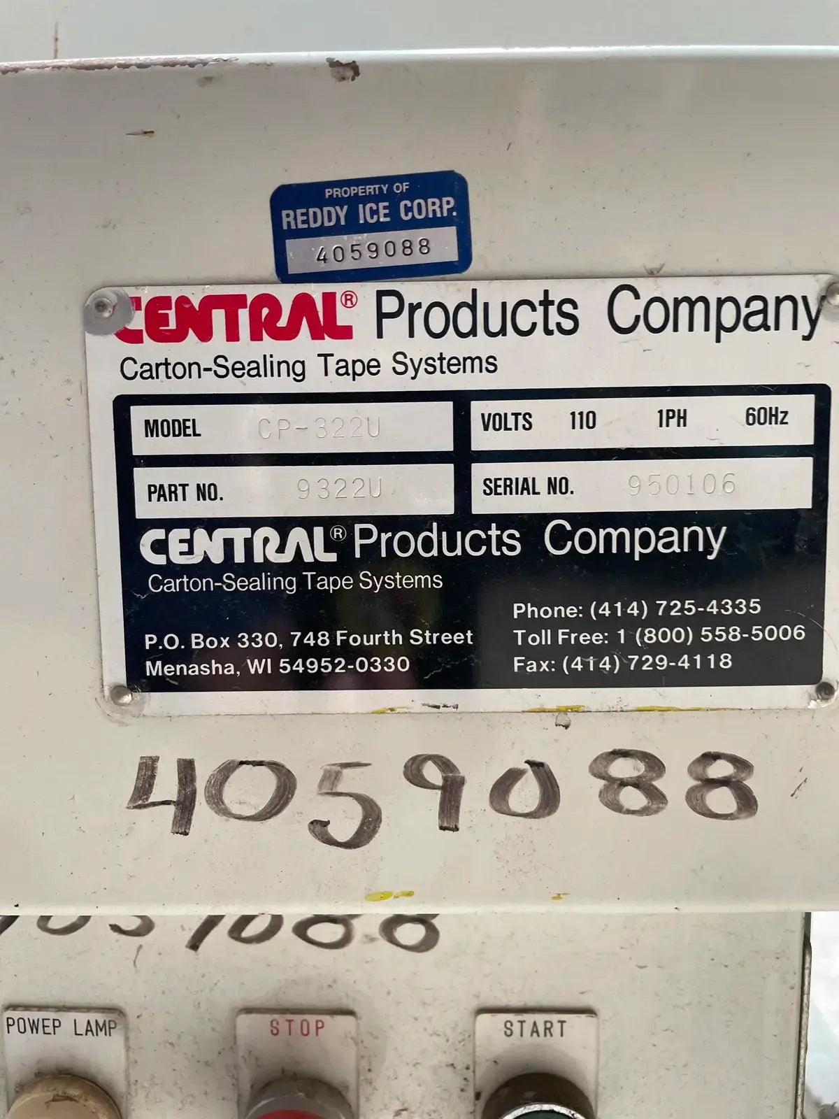 Central Products Company Sistemas de cintas para sellar cajas de cartón. Modelo: CP-322U. Número de serie: 950106. Número de pieza: 9322U. Fuente de alimentación - Voltios: 110, Ph: 1, Hz: 60. Accionado por dos motores de engranajes eléctricos Bodine - HP: 1/6, AMP: 1,9, Hz: 60, Ph: 1.