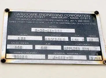 Sistema de refrigeración en tejados de Cargocaire Engineering Corporation. Modelo: S-30-11-D60. Serie: 122. 460V, trifásico, 60 Hz, 164,6 FLA. Nema 12. Orden de venta: 442. Trabajo: 442. Cliente: Applied Ing. Diagrama de cableado Industries 50020. Asamblea general J-442-50. Fecha: 3/88. Anteriormente funcionado en un supermercado hasta que fue retirado en febrero de 2016.