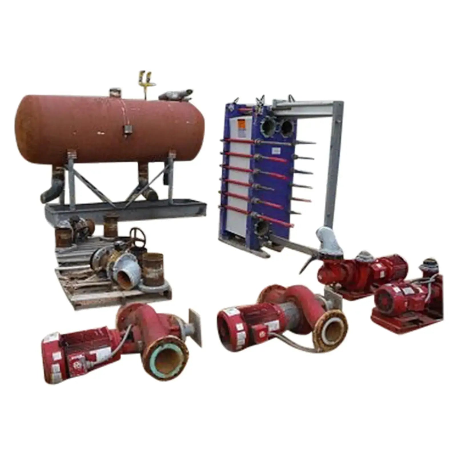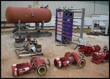 Sistema de Enfriamiento de Amoníaco-Glicol de 700 toneladas. 2004 Intercambiador de calor de placas de alta resistencia Alfa Laval. Modelo: M20MWFD. S/N: 3010799757. Clasificado a 250 psi a 230ºF. 1,153 pies cuadrados (2) bombas de alimentación de 15 HP, (2) bombas de recirculación de agua de 7.5 HP.