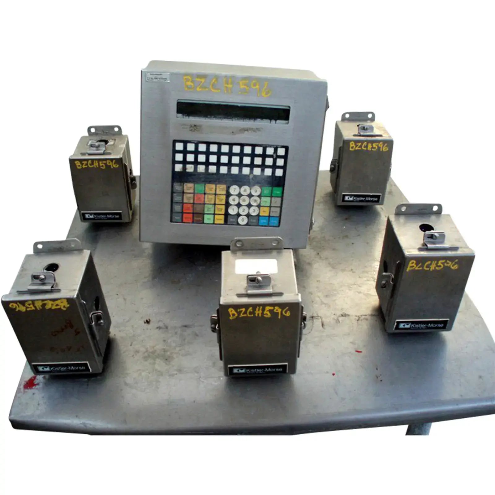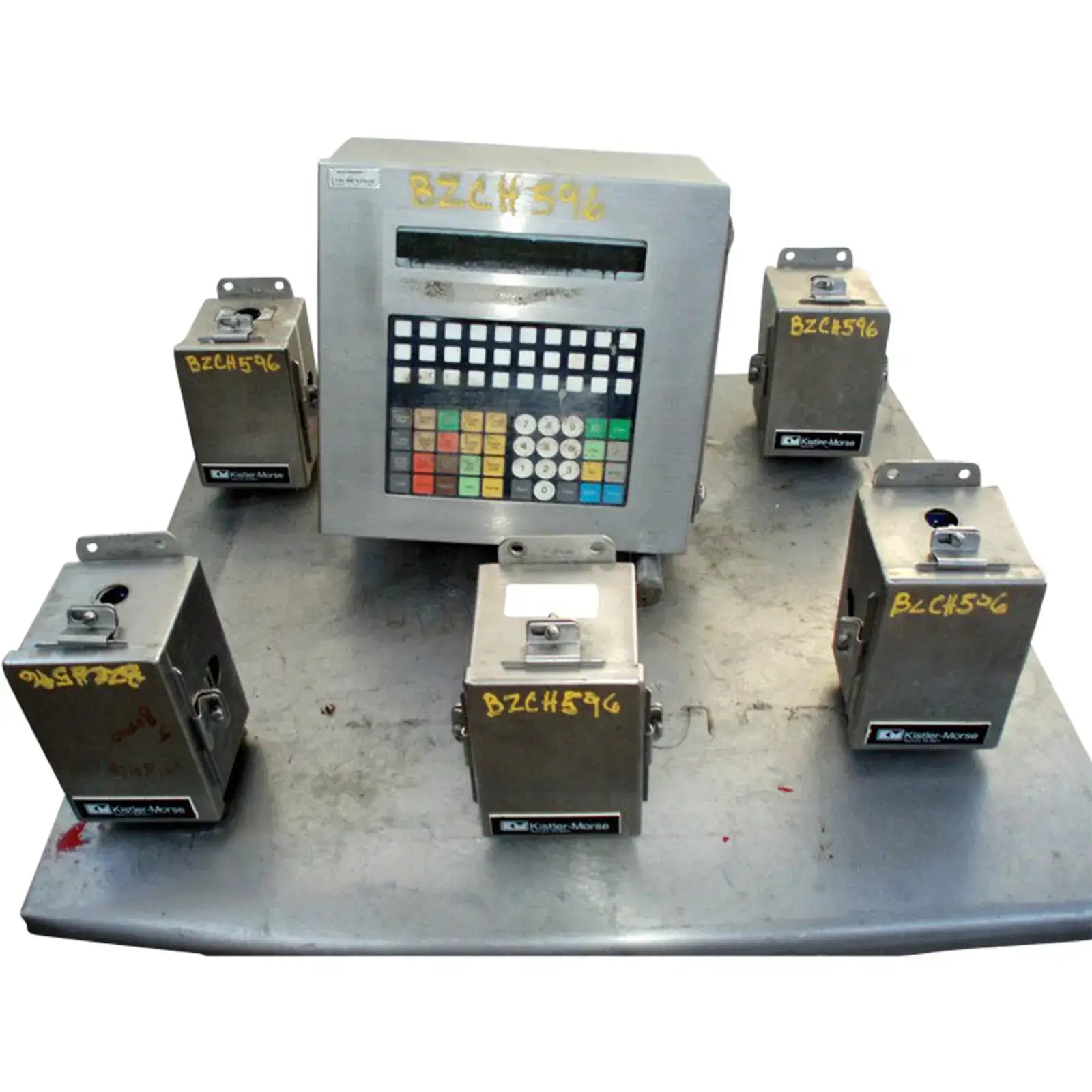 Sistema de pesaje Mettler Toledo / Kristler Morse. Modelo: 8305. Número de serie: 4292857-40T N-10000. Utiliza (5) cajas de conexiones de acero inoxidable Kristler Morse y (6) celdas de carga Kristler Morse. Requisitos de alimentación: 120 V, 0,5 amperios, 60 Hz. Fase única. Dimensiones de la caja de control principal: 1 pie ½ pulg. de largo x 6-3/8 pulg. de ancho x 1 pie 1-5/8 pulg. de alto. Dimensiones de la caja de conexiones: 5-3/8 pulg. de largo x 4-1/4 pulgadas de ancho x 4-5/8 pulgadas de alto. Dimensiones de la celda de carga: 5-1/2 pulgadas de largo x 3-1/2 pulgadas de ancho x 2 pulgadas de alto.