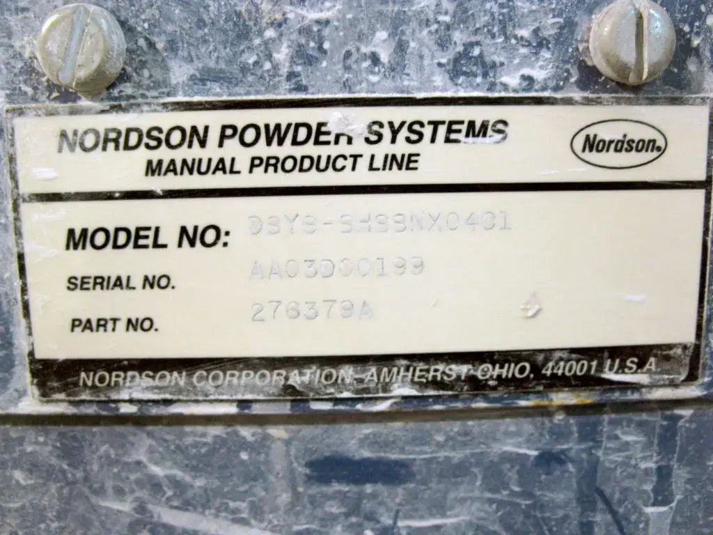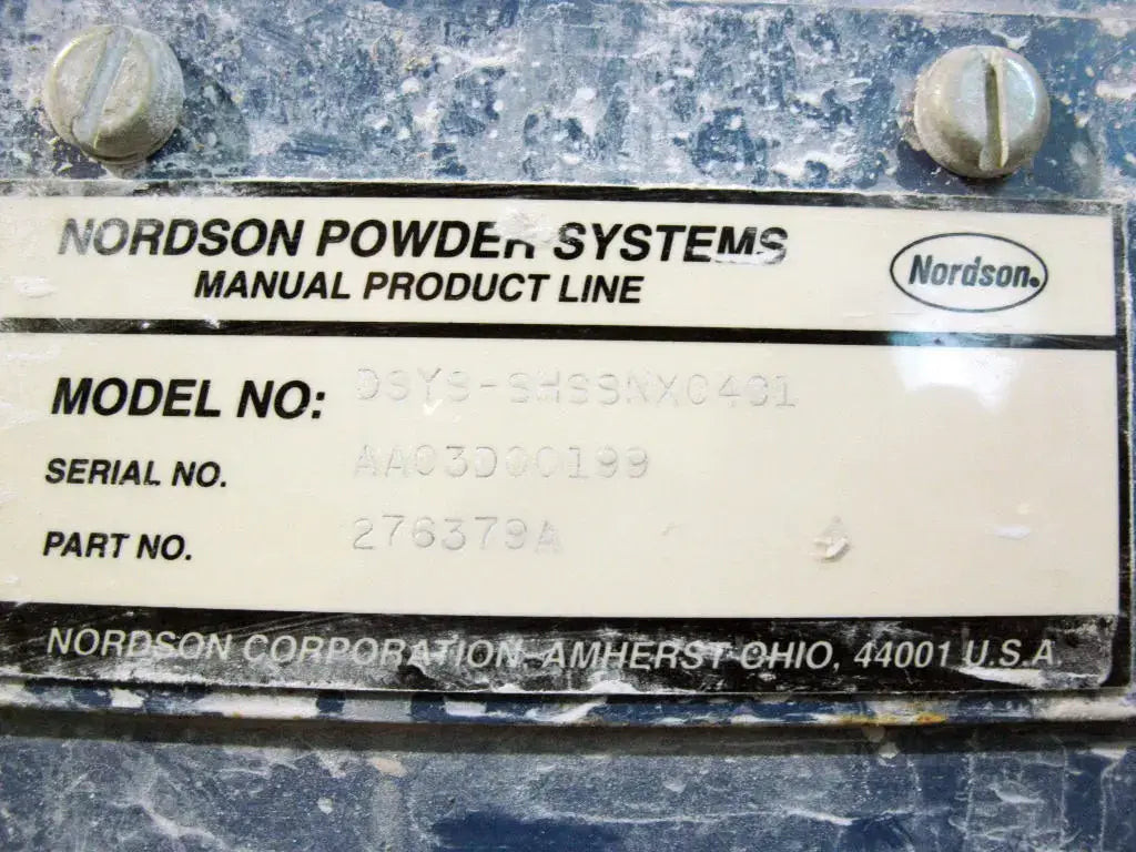 Sistema de polvo fluidizado con tolva de Nordson Corporation. Modelo: DSYS-SHSSNX04C1. Número de pieza. 276379A. Número de serie: AA03D00199. Pistola de aplicación: pieza no: 302123D. Número de serie: AA03D0030. Capacidad de tolva: 50 libras. Esta unidad proporciona una entrega constante de polvo, incluidos los polvos texturizados y metálicos que normalmente son más difíciles de rociar. Las tolvas se desmontan fácilmente para la limpieza rutinaria y el cambio de color. Dimensiones totales: 2 pies 1 pulgada de largo x 2 pies de ancho x 3 pies 8 pulgadas de alto (HCR) (ACN31).