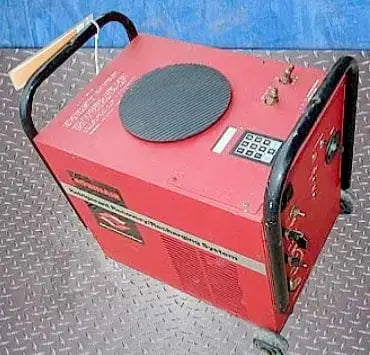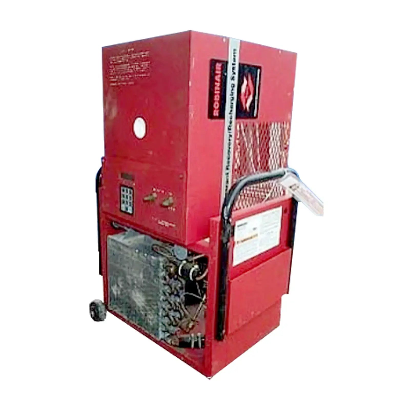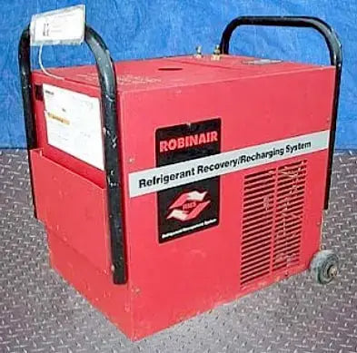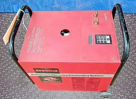 Sistema de recarga de recuperación de refrigerante Robinair. Modelo: 17600. S/N: 00359. Capacidad de recuperación: 50 lbs/carga. Control numérico digital superior. Potencia: 115 V, 60 Hz, 9,6 amperios. Refrigerante: R-12, R-22, R-500 y R-502. Dimensiones totales: 22 pulgadas de largo x 15 pulgadas de ancho x 22 pulgadas de alto.