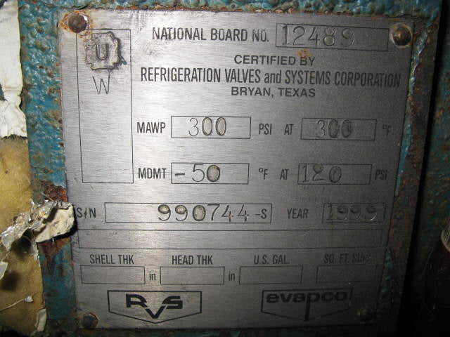 1999 Sistema de recirculación RVS / Evapco. Refrigerante: R-22 (freón). Capacidad: 222 galones. Dimensiones del tanque: 24 pulgadas de diámetro. x 10 pies 5 pulgadas de alto. MAWP 250 psi de -20 °F a 300 °F. MDMT: -50°F a 100 psi. Olla de aceite horizontal: 12 galones de capacidad. Dimensiones del recipiente de aceite: 10-3/4 pulg. x 3 pies. MAWP 300 PSI, -20 °F a 300 °F, MDMT: -50 F a 120 psi. Bomba Cornell 2001: modelo: 2CBS-CC, tamaño: 4-3-8.00. Capacidad: 20 gpm a 35 PSID, temperatura mínima: -60 °F, 2 hp/ 3 hp, 190-380/230-460 V, 3.5-7/4.1-8.2 amperios, 1450 /1750 rpm, 50/60 Hz, 3 fase. Bomba Cornell 1999: modelo: CBS-3-4, tamaño: 4-3-8.00. Capacidad: 20 gpm a 35 PSID, temperatura mínima: -60 °F, 2 hp/ 3 hp, 190-380/230-460 V, 3.5-7/4.1-8.2 amperios, 1450 /1750 rpm, 50/60 Hz, 3 fase. Bomba Cornell 1999: modelo: CBS-3-4, tamaño: 4-3-8.00. Dimensiones totales: 6 pies 3 pulgadas de largo x 4 pies 4 pulgadas de ancho x 16 pies 4 pulgadas de alto.