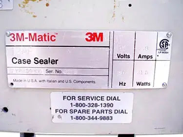 Sistema de sellado de cajas ajustable 3M-Matic 12AF. Modelo: 12AF. Tipo: 59300. S/N: 6275. Dimensiones máximas de la caja: 2 pies de largo x 1 pie 8 pulgadas de ancho x 1 pie 7 pulgadas de alto. Dimensiones mínimas de la caja: 6 pulgadas de largo x 4 pulgadas de ancho x 6 pulg. H. Fuente de alimentación: 115 V, 2,8 amperios, 60 Hz. (2) Accionamientos eléctricos Bodine, 1/9 hp, 1700 rpm, 60 Hz, 1,4 amperios, monofásico. Dimensiones del transportador: 5 pies de largo x 7 pulgadas de ancho. Altura de entrada/salida del transportador: 2 pies 1 pulgadas. Dimensiones totales: 5 pies 2 pulgadas de largo x 2 pies 5 pulgadas de ancho x 2 pies 9 pulgadas. H. (ACN123a)