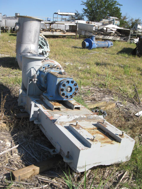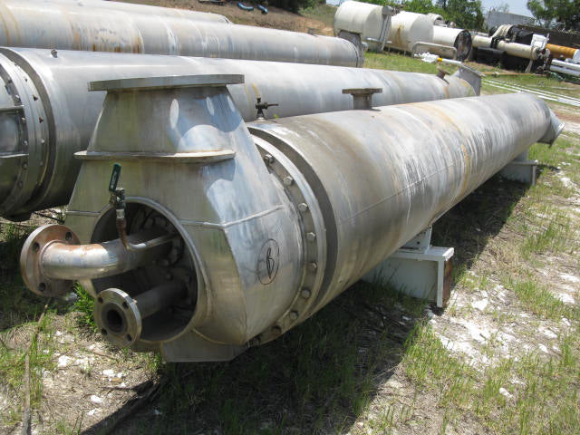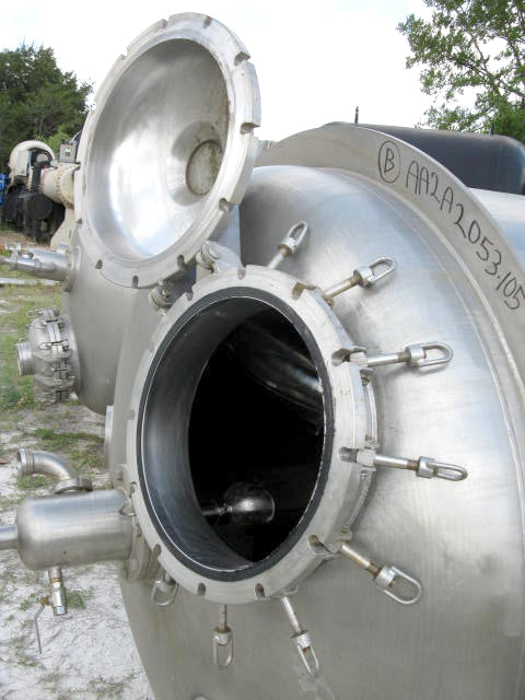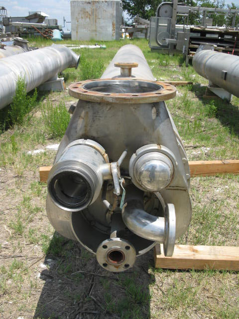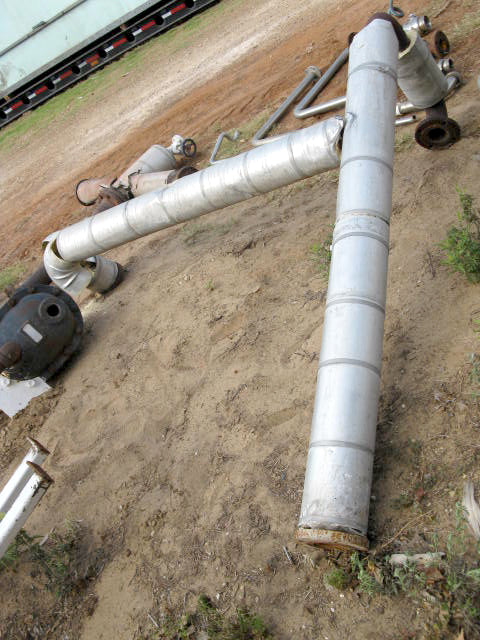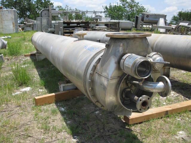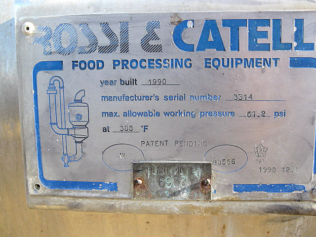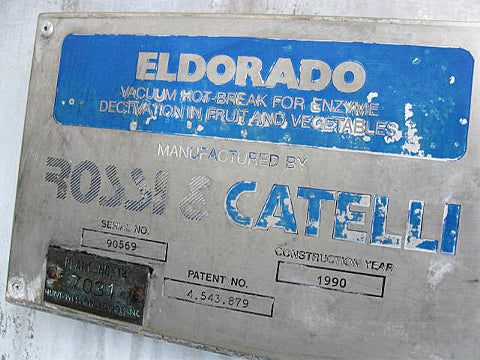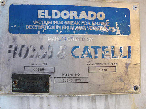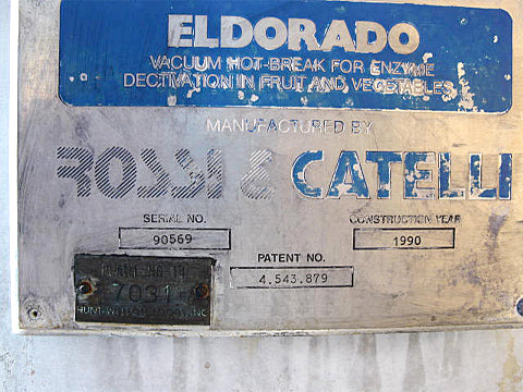 1990 Desactivador de enzimas Hot Break de Rossi & Catelli. Este sistema fue construido para recibir y descargar de forma continua 160-200 GPM (1340-1670 lbs/min) de tomates molidos. Esto se basa en una temperatura de entrada de 70 F y luego se calienta a 205 F usando 15 000-20 000 libras de vapor de 60 PSI. La clasificación nominal es de 40 a 50 toneladas cortas por hora basada en una relación de masa circulada de 15 a 20 partes de material calentado en circulación por cada parte de material fresco que se agrega (relación de 20:1). El sistema es similar en tamaño/tipo al actual modelo 1000 de Rossi. Junto con los productos de tomate, estos sistemas también se utilizan en algunas aplicaciones de frutas. Dentro de los intercambiadores de calor, el diámetro exterior del contacto de la superficie de calentamiento interior es de aproximadamente 20 pulgadas de diámetro. y el DI del contacto de la superficie de calentamiento exterior es de 24 pulgadas de diámetro. Este diseño es como un gran intercambiador de calor de triple tubo con medio en el tubo interior y la camisa exterior (el producto en la sección central). La longitud aproximada del contacto calefactor es de 298 pulgadas. El volumen estimado de producto dentro de un único intercambiador de calor es de 23,8 pies cúbicos (178 galones). Este sistema está diseñado para producciones continuas de varias semanas de duración, dando como resultado zumos y concentrados de alta viscosidad, conservando la calidad, el color y las características naturales del producto, inalterados. Clasificaciones del intercambiador de calor: 61,2 PSI a 308º F. Entradas/salidas: 12 pulgadas de DI, 3-1/2 pulgadas de DI, 3 pulgadas de DI, 2 pulgadas de DI, válvula de bola de 1 pulgada. Capacidad aproximada del separador de fondo cónico: 800 galones con una pared recta: 59 pulgadas de alto y diámetro interior: 61 pulgadas. Entradas/salidas del tanque: inferior 19-1/2 pulgadas, lateral 12 pulgadas, superior 3-1/ Características de la unidad de 2 pulgadas: Manway de 18 pulgadas y bola rociadora de limpieza. Dimensiones totales del intercambiador de calor: 26 pies 11 pulgadas de largo x 30 pulgadas de ancho x 4 pies de alto. Dimensiones totales del tanque de vacío: 5 pies 9 pulgadas de largo x 6 pies 5-1/2 pulgadas de ancho x 11 pies 6 pulgadas de alto (ACN6250).(HB1).