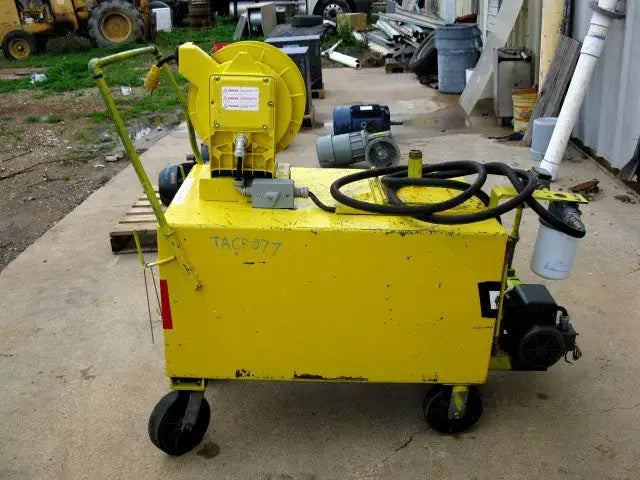 Sistema Móvil de Recuperación de Petróleo. Equipado con Woodhead Aero-Motive de 50 pies, carrete de cable eléctrico Pow-R-Mite para fácil acceso, medidor digital electrónico GPI y un motor eléctrico Baldor: ¾ HP, 1725 rpm, 115/230 V, 8,4/4,2 amperios, 60 Hz , 1 fase. Dimensiones totales: 4 pies 6 pulgadas de largo x 2 pies 3 pulgadas de ancho x 4 pies de alto (H17).