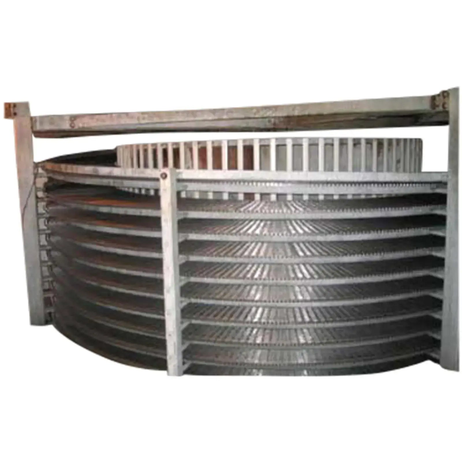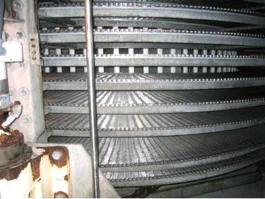 Sistemas de congelación Congelador en espiral Spiro-Freeze. Este congelador permitirá al usuario congelar dos flujos de productos separados al mismo tiempo. La entrada de aire es de arriba hacia abajo, pasando por el centro y luego hacia arriba a través de los niveles apilados que contienen el producto. (2) Las correas de alimentación comienzan una al lado de la otra y se apilan a medida que ingresan al congelador. Se usó por última vez para congelar trozos de berenjena de 1,8 oz. Las piezas entraron a 180 °F con un tiempo de permanencia de 22 minutos y salieron a 18-20 °F. Capacidad: aprox. 2600 libras/h. Congelador en espiral: 1 torre, 2 pilas, 8,5 niveles cada una. Altura de alimentación: 36 pulgadas cada correa. Altura de descarga: correa n.° 1: 11,3 pulg.; cinturón n.º 2: 11,9 pulg. Espaciado entre niveles: 6 pulg. Espacio libre del producto: 3 pulg. Ancho de la correa: 30 pulg.; utilizable 28 pulg. Longitud del cinturón activo: 854 pies; longitud total de la correa 1110 pies. Transmisión variable AC de Ram Industries: 7,5 hp. Componentes de refrigeración no incluidos. Dimensiones totales: 35 pies de largo x 35 pies de ancho x 15 pies de alto. Instalado en 2000; dado de baja en octubre de 2005. Funcionó 50 semanas al año; 45 hrs/semana.(HB2)