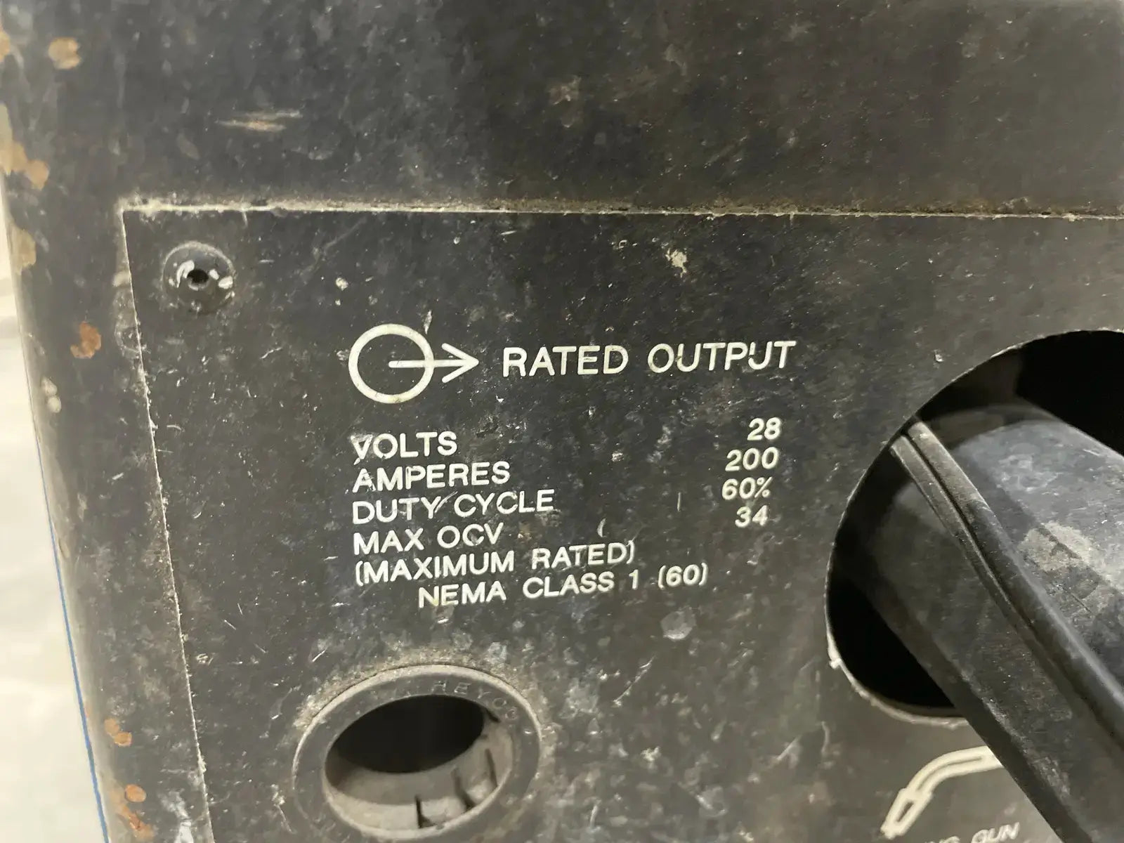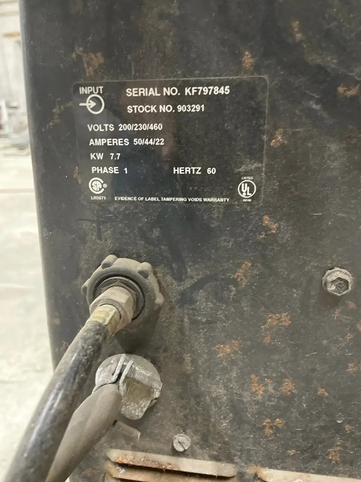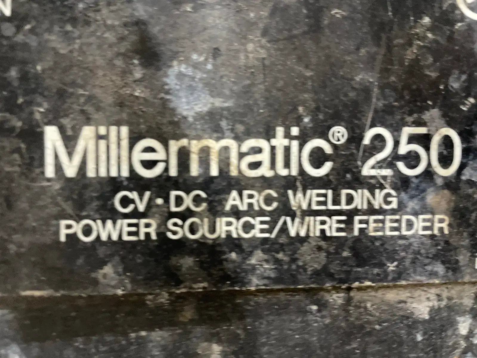 Fuente de alimentación/alimentador de alambre para soldadura por ARCO Millermatic 250 CV-DC - No. de serie: KF797845, No. de inventario: 903291. Procesos: soldadura por arco metálico con gas (MIG), soldadura por arco con núcleo fundente (FCAW). Fuente de energía para soldadura por arco y alimentador de alambre. Entrada nominal: Voltios: 200/230/460, Amperios: 50/44/22, KW: 7,7, Fase: 1, Hercios: 60. Salida nominal: Voltios: 28, Amperios: 200, Ciclo de trabajo: 60%, OCV máx. : 34, (clasificación máxima) NEMA Clase 1 (60)