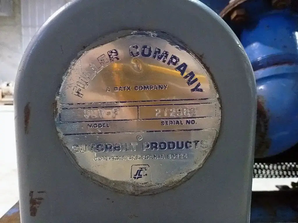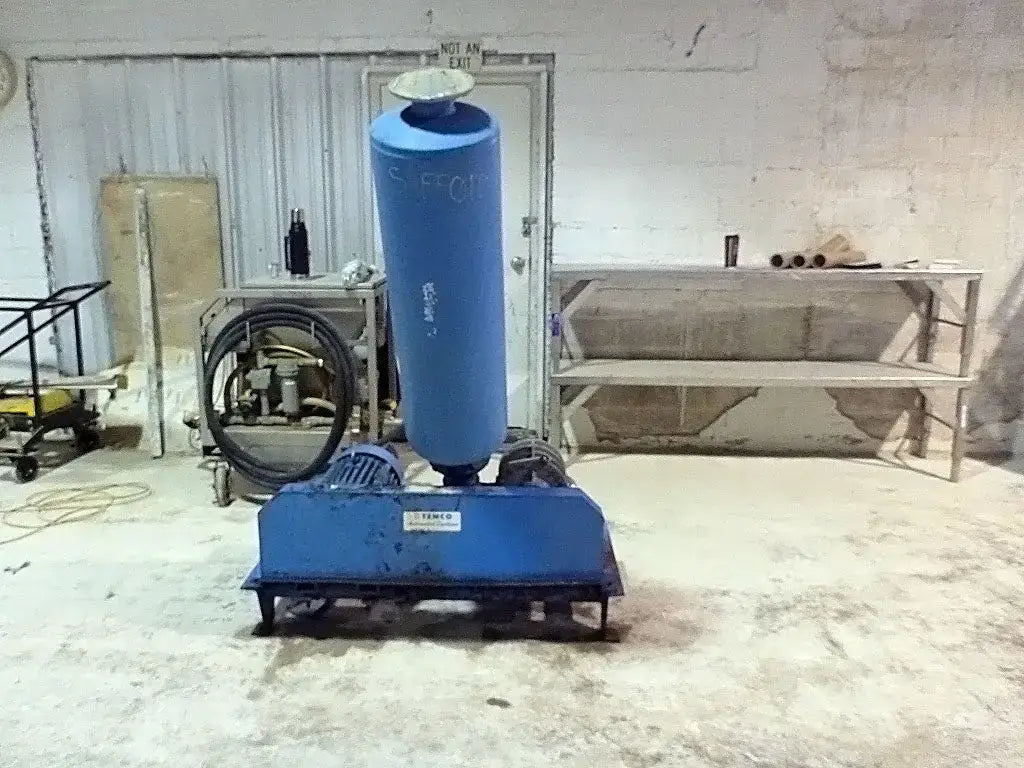 Soplador rotativo positivo Sutorbilt (Fuller Company). Modelo: 5LV-F. El desplazamiento aproximado del soplador nuevo es de 568 cfm con la potencia y presión requeridas. Soplador giratorio: 2300 rpm, 6 psi, 0,42 kg/cm². Temperatura de descarga: 260°F. Motor Teco Electric and Machinery Co.: 15 hp, 1745 rpm, 230/460 V, 36/18 amperios, pies cuadrados: 1,15, 60 Hz, trifásico. Silenciador universal Temco Automated Systems, modelo RD-4, pieza 57104AA, S/N: R1061A-00. Dimensiones totales: 4 pies 5 pulgadas de largo x 3 pies 4 pulgadas de ancho x 6 pies 4 pulgadas de alto.