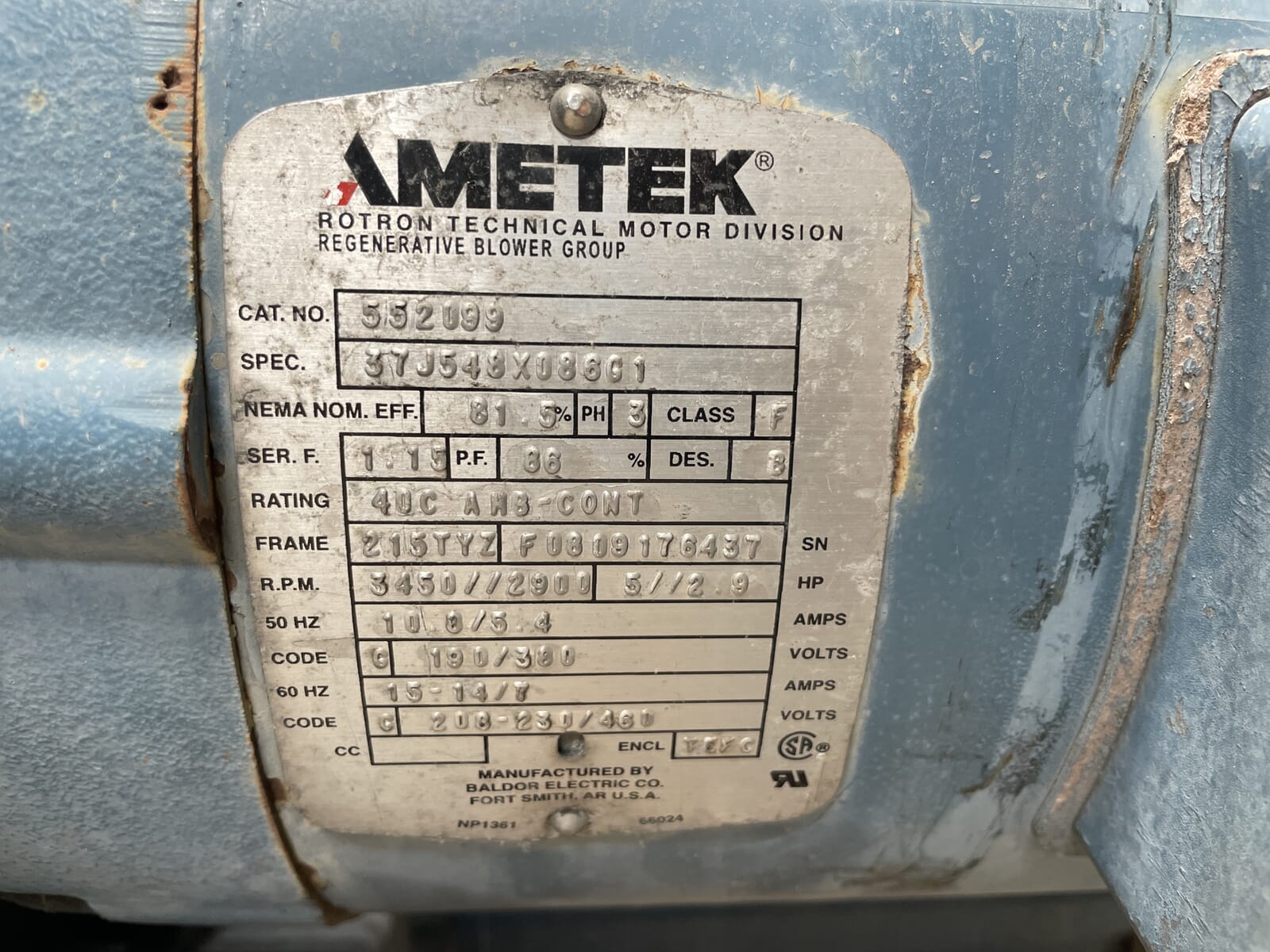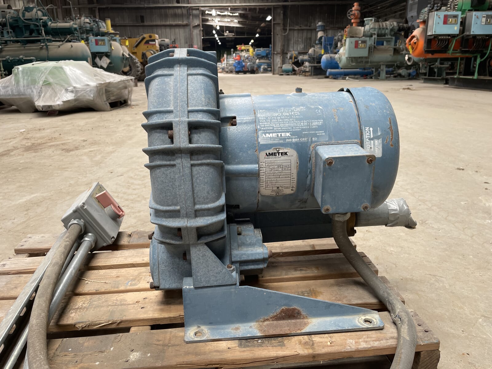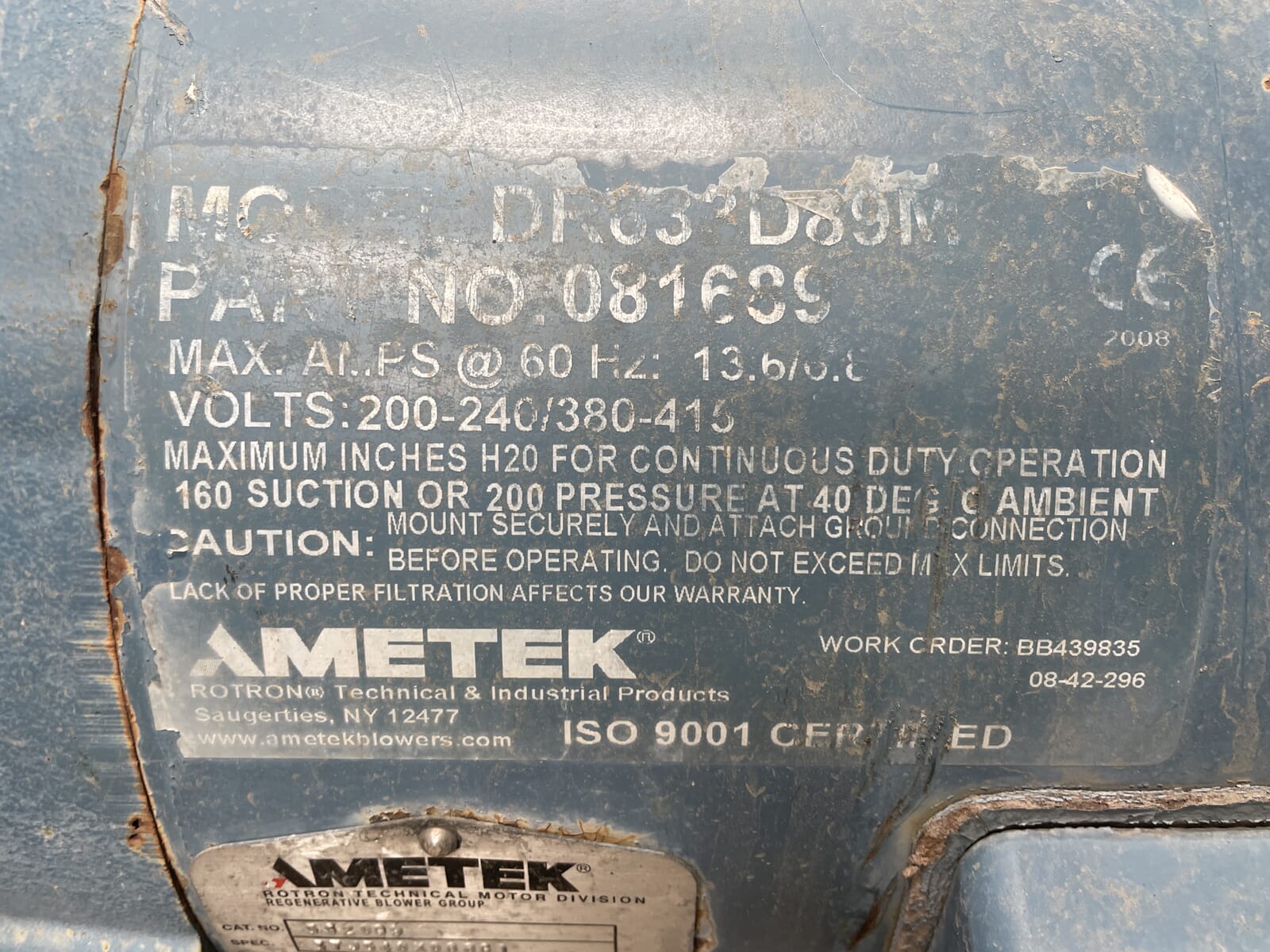 Soplador Reintegrativo AMETEK Rotron. Modelo: DR833. Número de pieza: 081689. Fuente de alimentación: Amperios máximos a 60 Hz: 13,6/6,8. Voltios: 200-240/380-415. Máximo de pulgadas H20 para funcionamiento continuo 160 de succión o 200 de presión a 40 grados. RPM totales: 3450/2900, caballos de fuerza: 5/2,9. Adjunto: TEFC.