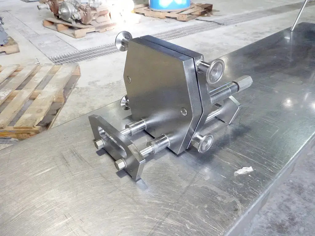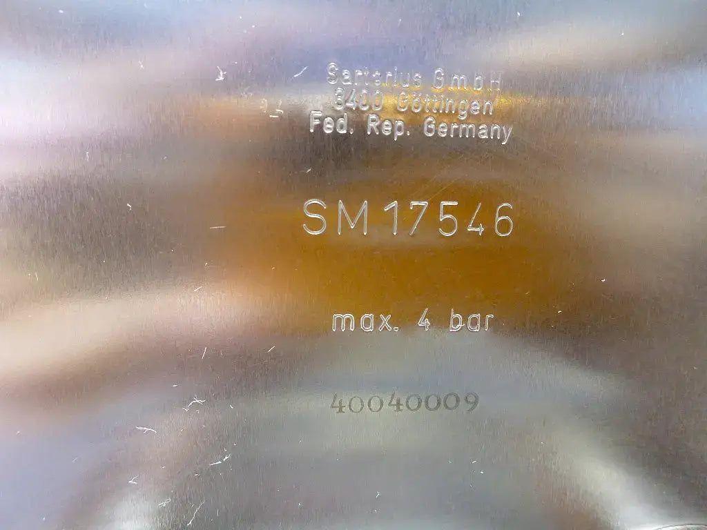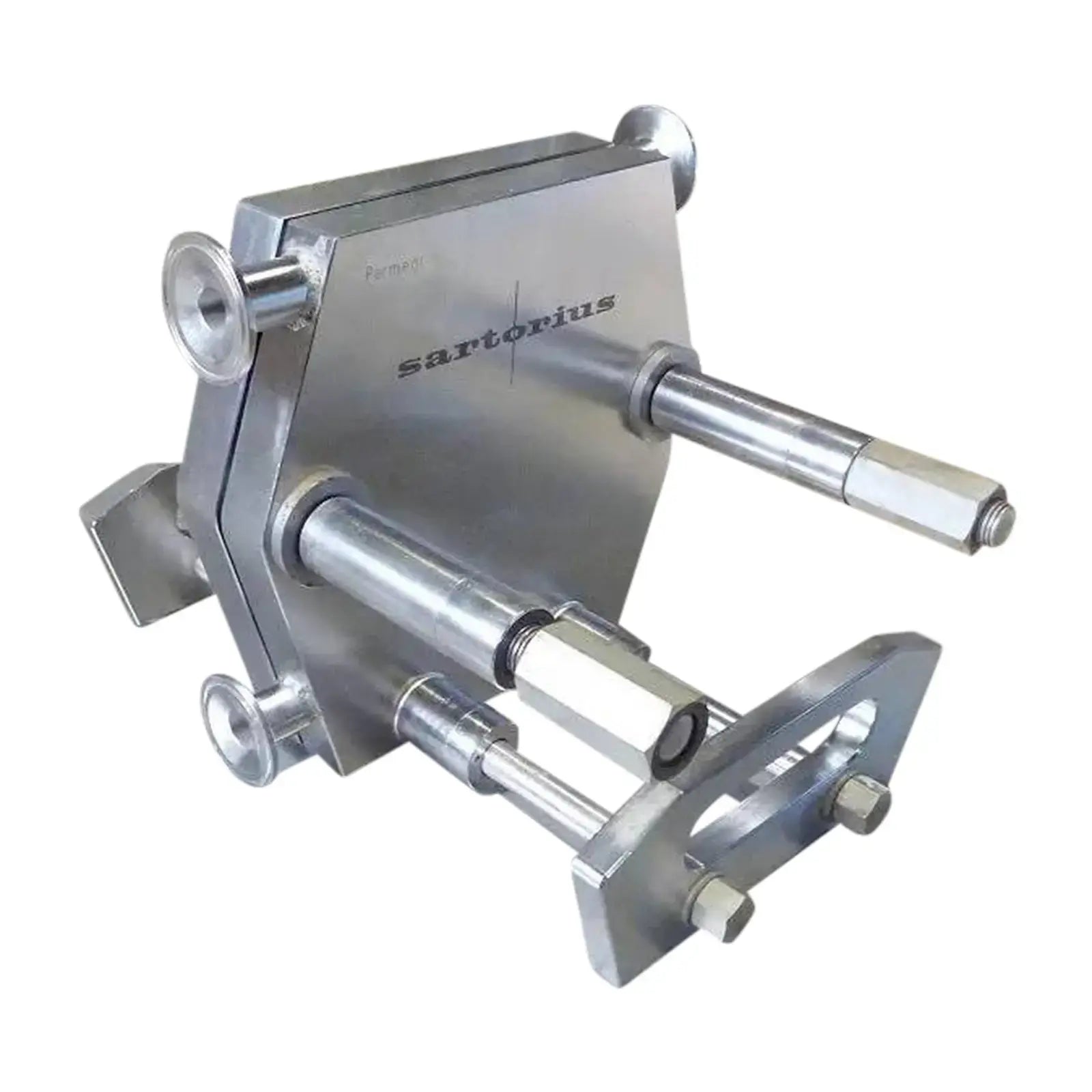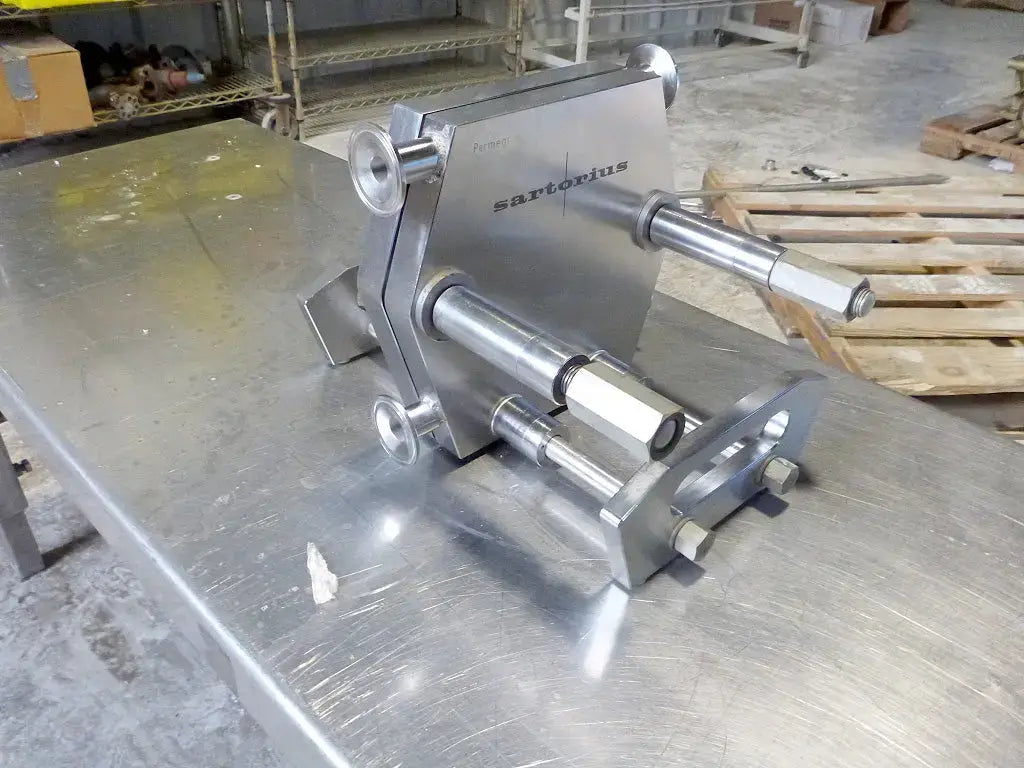 Soporte de flujo cruzado de acero inoxidable Sartocon para casetes Sartocon. Hecho en Alemania. Modelo: SM17546. S/N: 40040009. Presión máxima: 4 bar (58 PSI). 316SS. Conectores sanitarios tri-clamp.