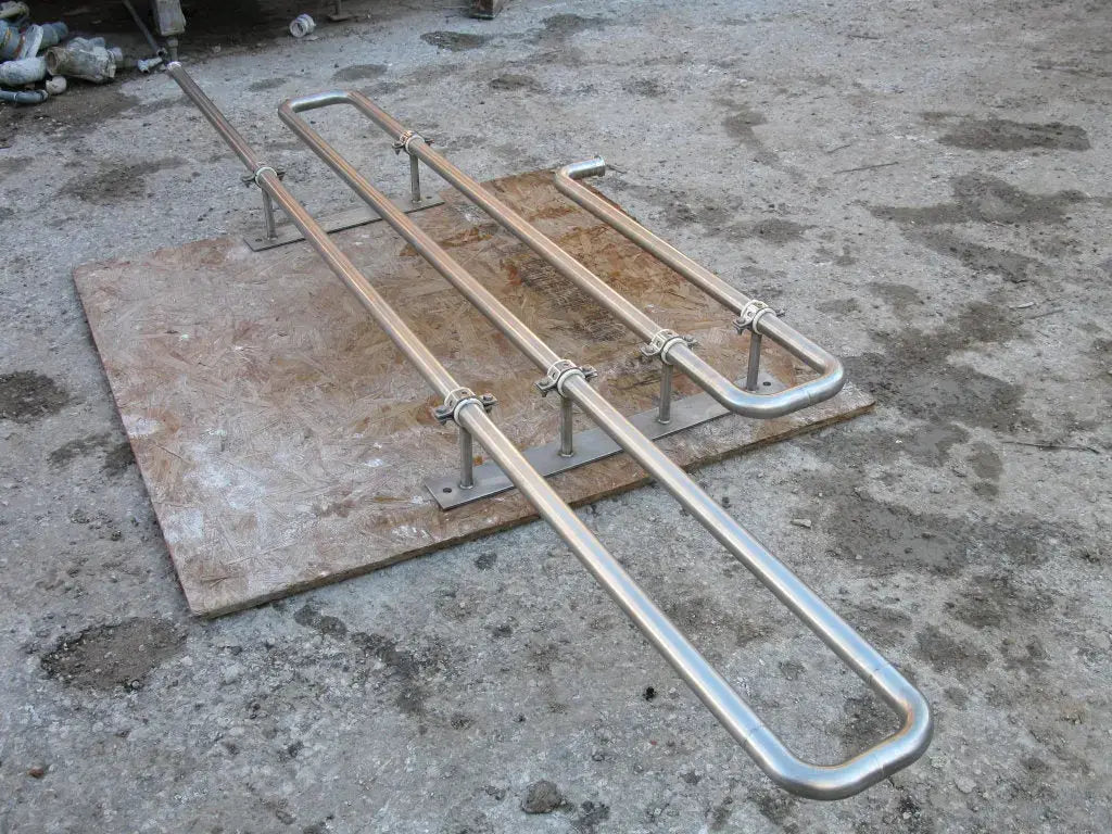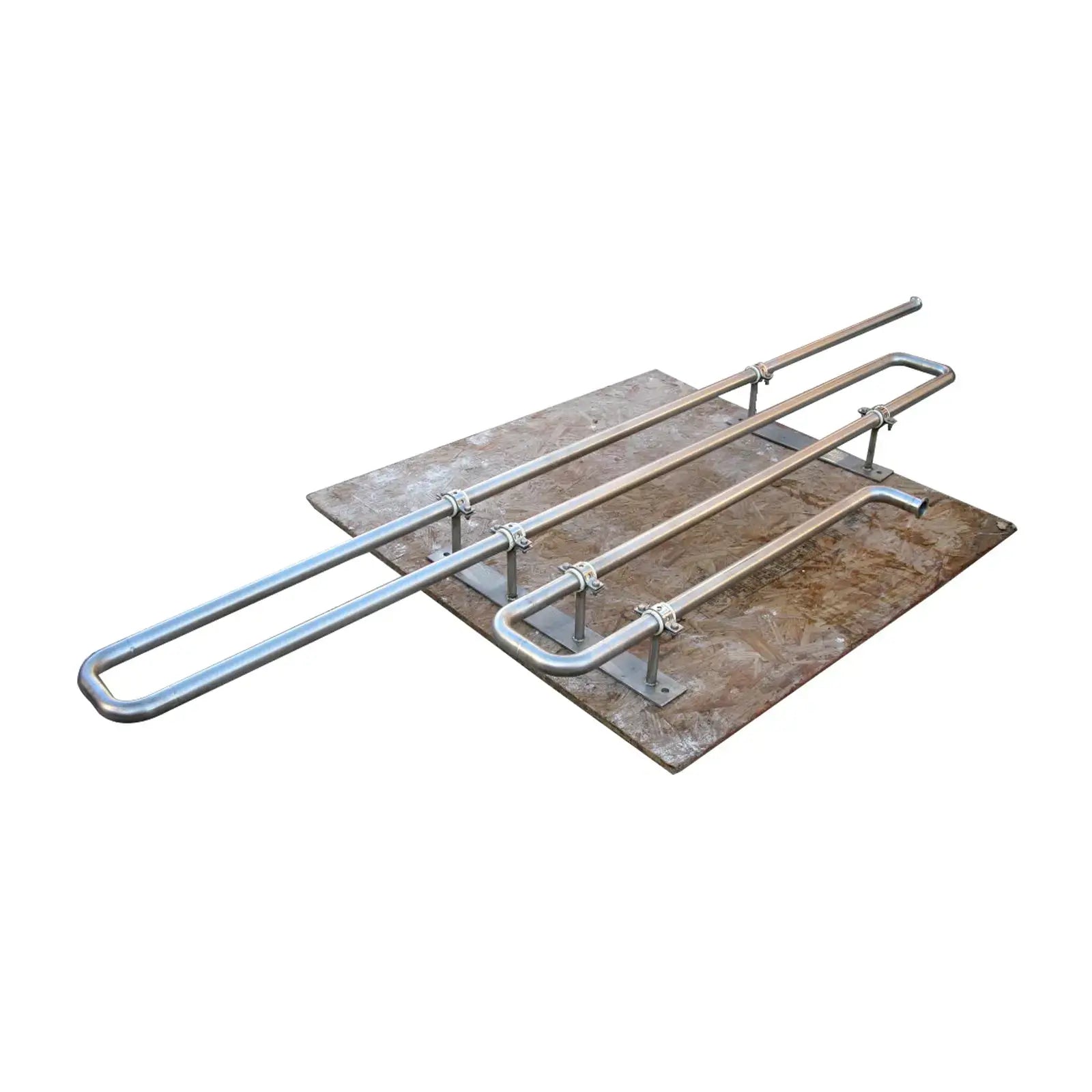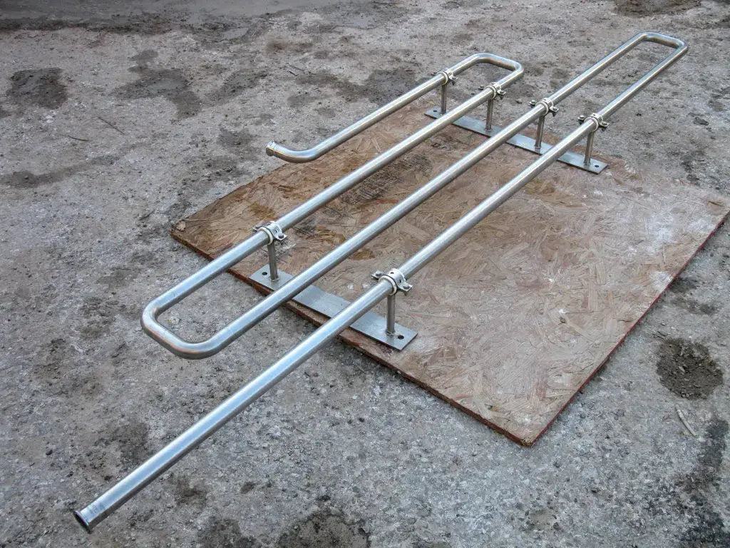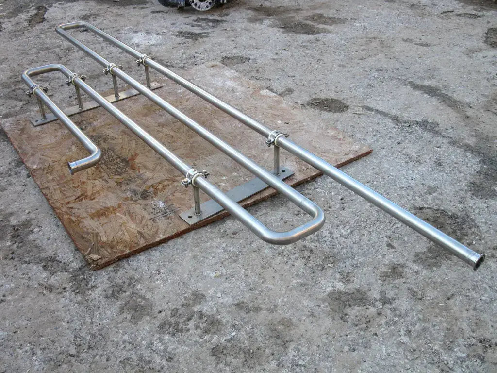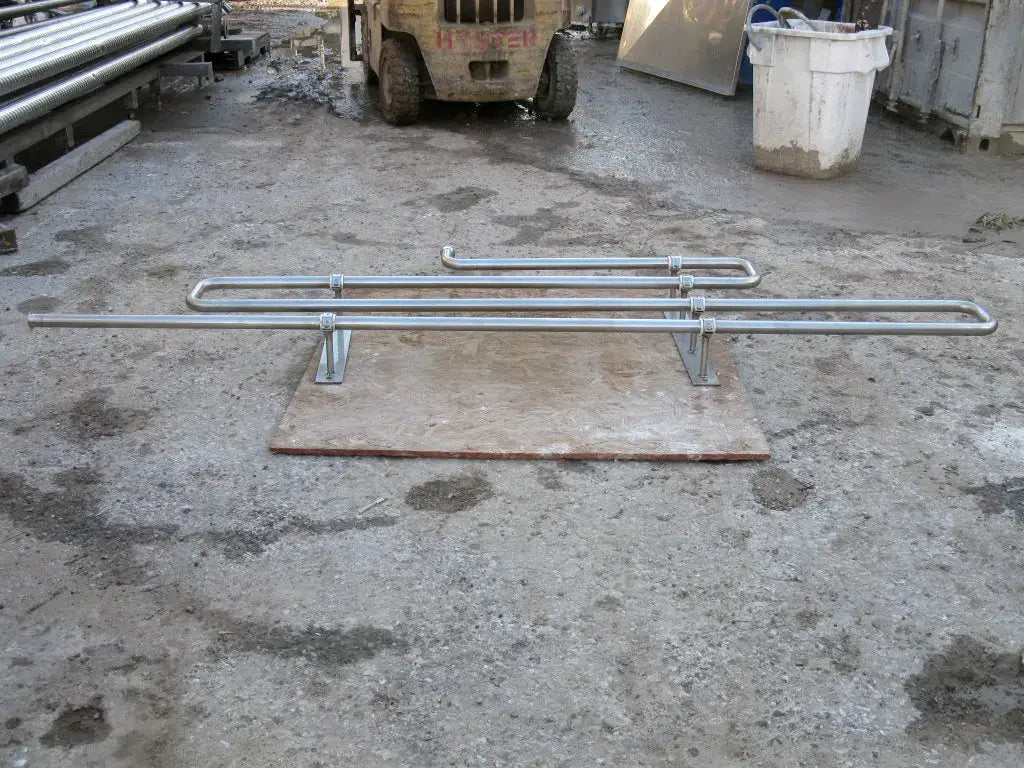 Tubos de acero inoxidable. (2) Puertos S-line de 1-1/2 pulg. 1-1/2 pulg. de diámetro. tubo. Dimensiones totales: 9 pies ¼ pulgadas de largo x 2 pies 2-3/8 pulgadas de ancho x 7 pulgadas de alto.