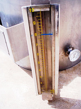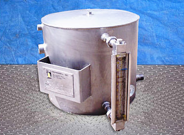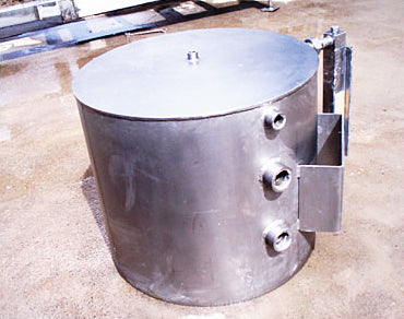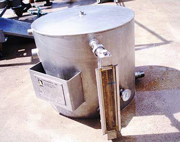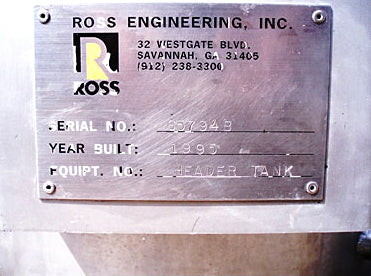 1995 Tanque colector de acero inoxidable Ross, S/N: 65794B. Entradas: (2) 1 pulg. FNPT, (1) 3/4 pulg. FNPT. Salida: (1) 1 pulg. MNPT. Dimensiones del tanque colector: 2 pies de largo x 1 pie 10 pulgadas de ancho x 1 pie 4 pulgadas de alto.