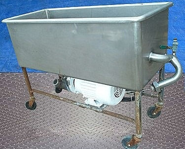 Tanque COP de acero inoxidable: 75 galones. Dimensiones interiores: 50 pulgadas de largo x 20 pulgadas de ancho x 17-1/2 pulgadas. Construcción de acero inoxidable. Bomba centrífuga Ampco, modelo: ZC2, S/N: T-54281-1-1, diámetro del impulsor: 5-1/2 pulg., capacidad de la bomba: 196 gpm. Motor Century, 7,5 hp, 3500 rpm, 230/460 V, 20-10 amperios, 60 Hz, trifásico. Las bombas de la serie Z de servicio pesado tienen un espesor de pared máximo de 150 psi. El tanque rueda sobre (4) ruedas para facilitar su posicionamiento. Entrada de la bomba: línea 'S' de 2-1/2 pulgadas, salida de la bomba: línea 'S' de 2 pulgadas. Descarga del tanque: rosca de 3 pulg. (macho). Dimensiones totales: 59 pulgadas de largo x 23 pulgadas de ancho x 39 pulgadas de alto.