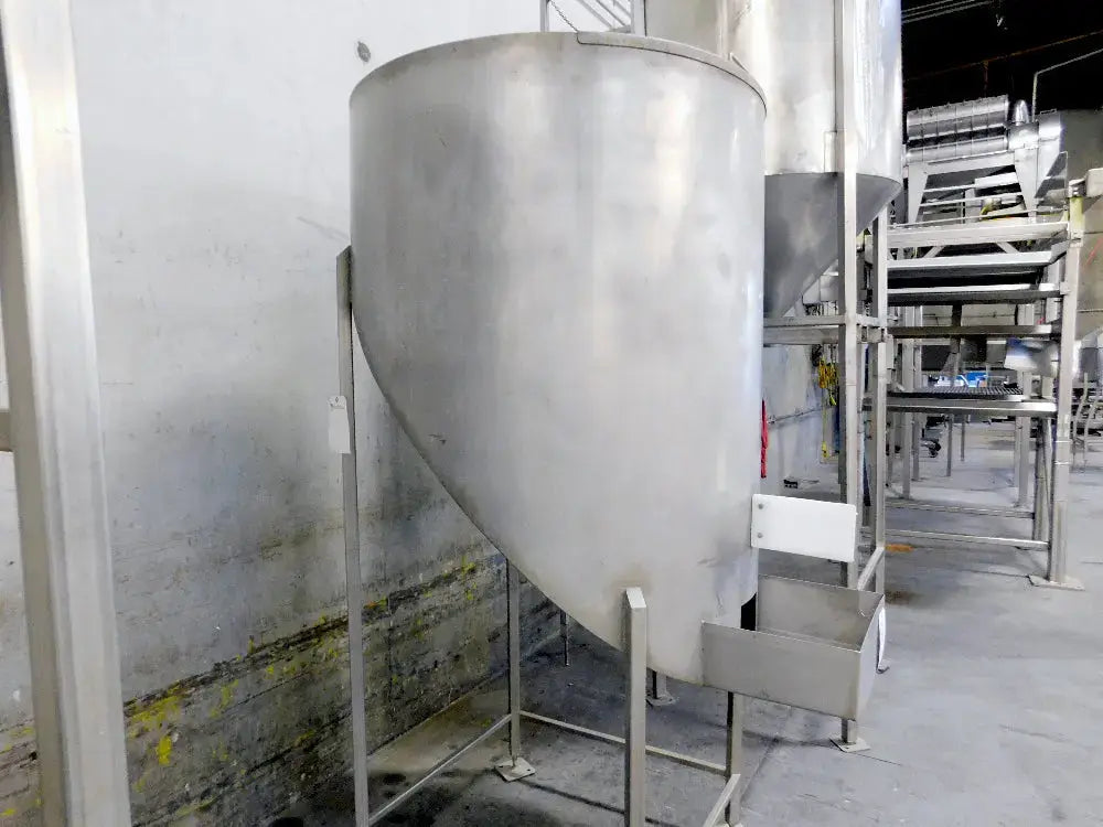 Tanque de acero inoxidable, 46 de diámetro, descarga con pendiente pronunciada, un lado mide 14 de alto, un lado mide 60 de alto, parte superior cubierta. Capacidad estimada: 250 galones.