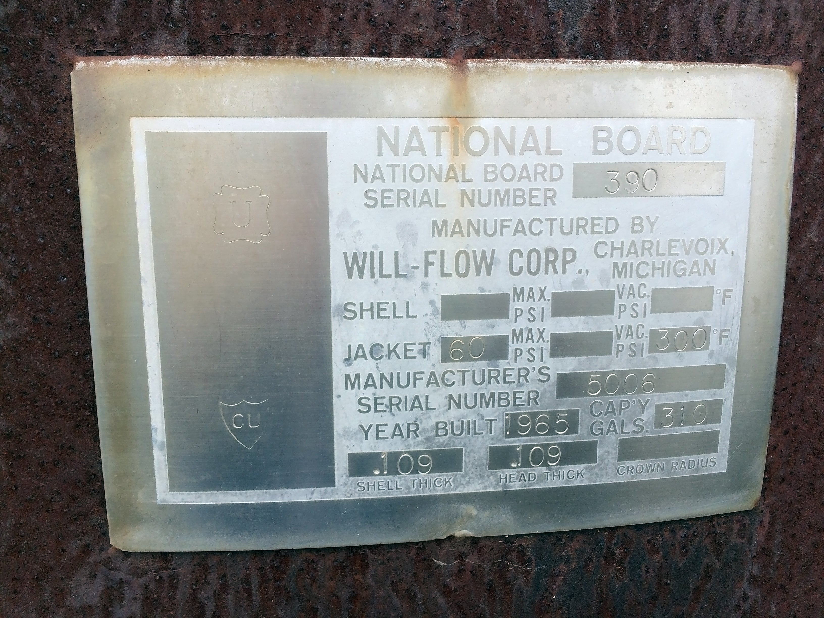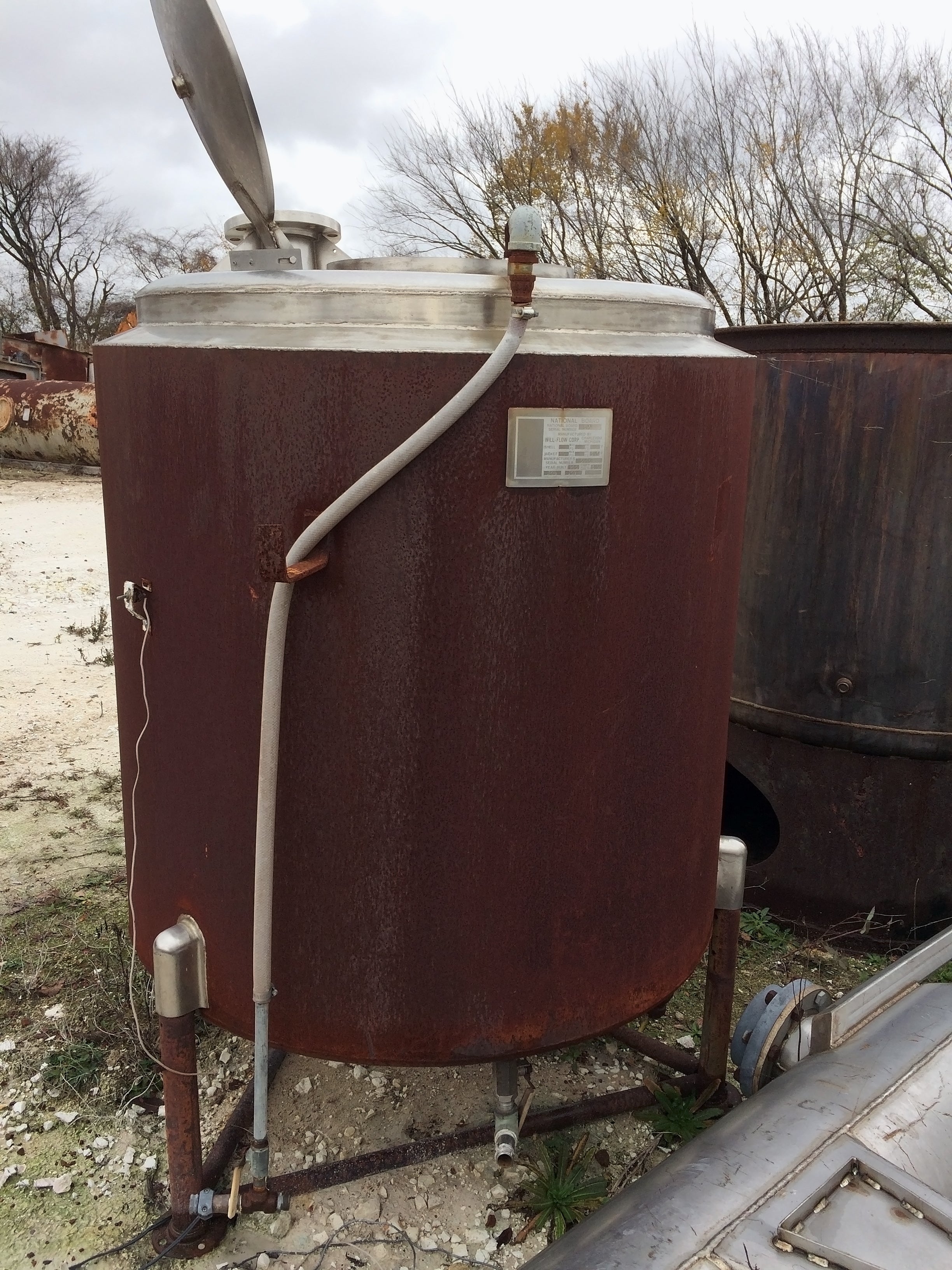 Tanque de acero inoxidable Will-Flow Corp. Serie: 5006. Capacidad: 310 galones. Nacional. Bd.: 390. Clasificación de la chaqueta: 60 PSI a 300 F. *Nota: la unidad falló la prueba de fugas de la camisa.