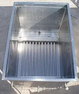 Tanque de cocción/enfriamiento con camisa Mueller: 470 galones. Dimensiones interiores de pared recta: 5 pies de largo x 3 pies 6 pulgadas de ancho x 3 pies 7-1/2 pulgadas de alto. Número de tubos de calor/frío: 11. Dimensiones del tubo: 1-1/4 pulgadas. diámetro. x 3 pies 7 pulgadas L. Volumen del tubo: 2,5 galones. Entradas: (1) 3/4 pulg. de diámetro. Accesorio FNPT, (1) entrada de producto de 5 pies de largo x 3 pies 6 pulgadas de ancho, (2) 1 pulgada de diámetro. Racores NPT (chaqueta). Salidas: (1) 3 pulg. de diámetro. Puerto de drenaje S-line, (1) 3/4 pulg. de diámetro. Accesorio FNPT, (3) 1 pulg. de diámetro. Accesorios FNPT, (1) 1 pulg. de diámetro. Racor NPT (chaqueta). Dimensiones totales: 5 pies 11 pulgadas de largo x 4 pies 2 pulgadas de ancho x 4 pies 5-1/4 pulgadas de alto.
