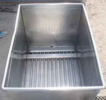Tanque de cocción/enfriamiento con camisa Paul Mueller: 475 galones. Dimensiones interiores de pared recta: 5 pies de largo x 3 pies 6 pulgadas de ancho x 3 pies 8 pulgadas de alto. Número de tubos de calor/frío: 11. Dimensiones de los tubos: 1-1/4 pulgadas de diámetro. x 3 pies 7 pulgadas L. Volumen del tubo: 2,5 galones. Entradas: (2) 1 pulg. de diámetro. puertos (chaqueta), (1) entrada de producto de 5 pies de largo x 3 pies 6 pulgadas de ancho. Salidas: (2) 3/4 pulg. de diámetro. Conexiones FNPT, (1) 2 pulg. de diámetro. Puerto de drenaje S-line, (1) 1 pulg. de diámetro. Accesorio FNPT, (1) 1 pulg. de diámetro. puerto, (1) 1 pulg. de diámetro. puerto (chaqueta). Dimensiones totales: 5 pies 5 pulgadas de largo x 3 pies 10 pulgadas de ancho x 4 pies 6-1/4 pulgadas de alto.