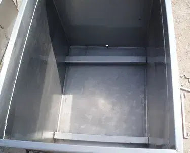 2000 Tanque de cocción/enfriamiento con camisa Paul Mueller: 560 galones. Número de serie: 250063-1. Nat'l Bd: 30823. Dimensiones interiores de pared recta: 5 pies de largo x 3 pies 6-1/2 pulgadas de ancho x 4 pies 3-1/2 pulgadas de alto. MAWP: 90 psi a 400°F . MDMT: 30°F a 90 psi. Entradas: (1) 1 pulg. de diámetro. puerto (chaqueta), (1) entrada de producto de 5 pies de largo x 3 pies 6-1/2 pulgadas de ancho. Salidas: (1) 2 pulg. de diámetro. Puerto de drenaje S-line, (1) 1/2 pulg. de diámetro. puerto, (1) 1 pulg. de diámetro. puerto (chaqueta), (1) 1 pulg. de diámetro. Conexión FNPT. Dimensiones totales: 5 pies 9 pulgadas de largo x 4 pies 8 pulgadas de ancho x 5 pies 2 pulgadas de alto.