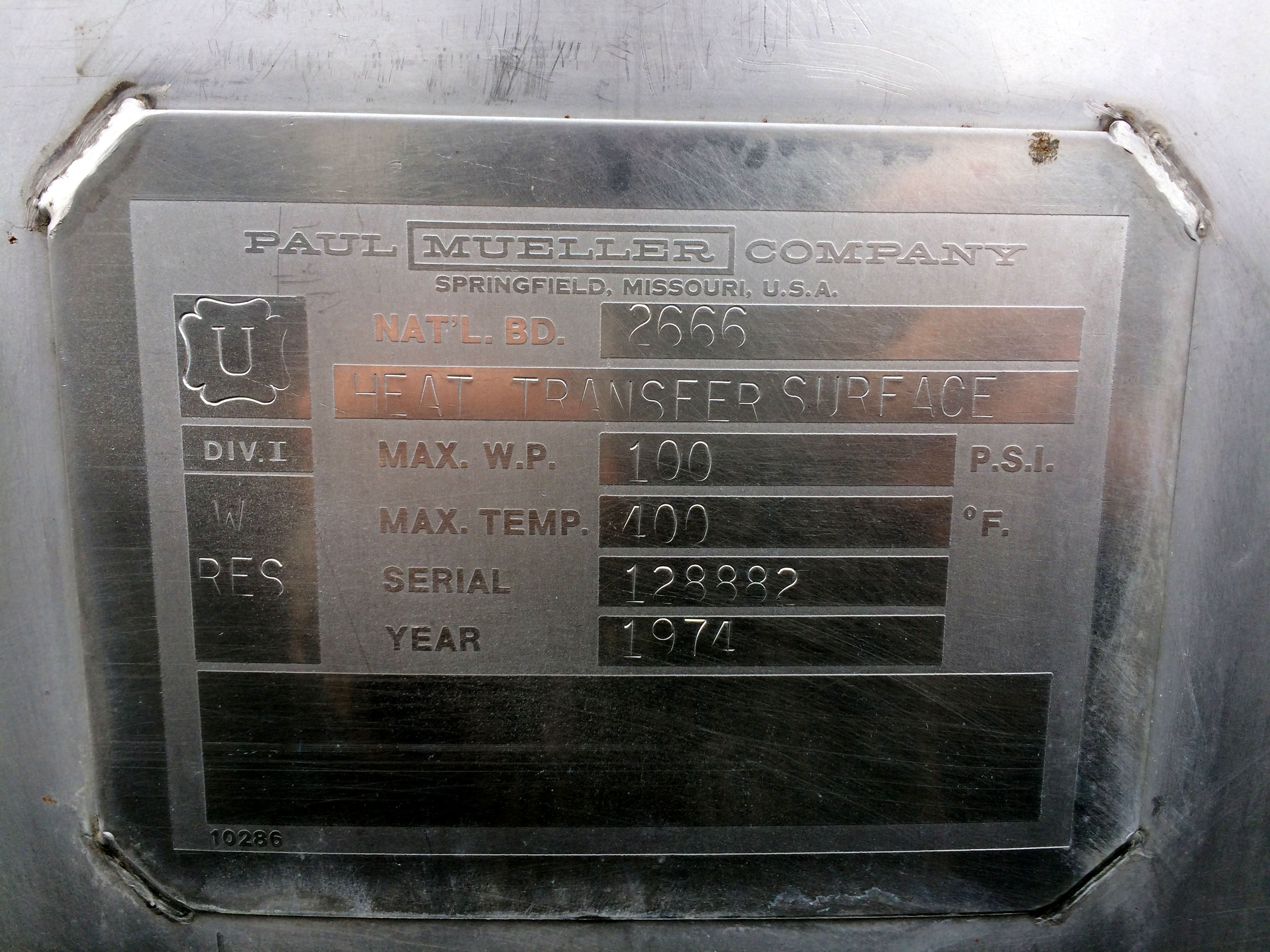 Tanque de mezcla Mueller de acero inoxidable. Capacidad aproximada: 300 galones. MAWP: 100 psi. Temperatura máxima: 400 °F. Indicador de nivel de flotador. (1) bola flotante de 5 pulgadas. Entradas/salidas: (1) orificio de puerto de 4 pulg. (1) Puerto S-line de 3 pulgadas. (2) Orificio de puerto de 2 pulg. (1) 1-1/2 pulg. MNPT. (1) 1 pulg. MNPT. Dimensiones interiores del tanque: 4 pies de diámetro. x 3 pies 2-1/2 pulgadas de pared recta. *Nota: la prueba de presión de la chaqueta falló. Dimensiones totales: 5 pies de largo x 4 pies 6 pulgadas de ancho x 6 pies 9 pulgadas de alto.