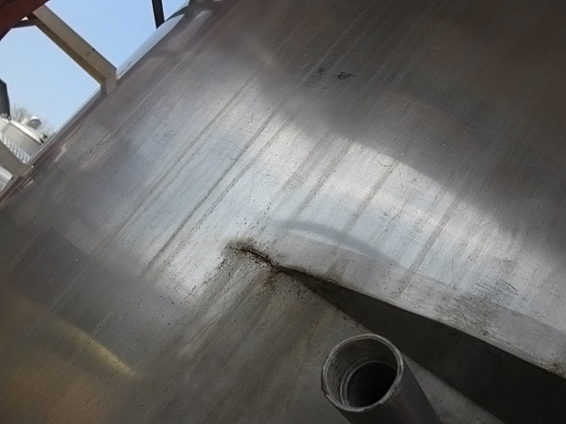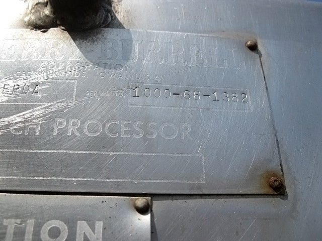 Procesador con camisa Cherry Burrell: 1000 galones. Modelo EPDA. Número de serie 1000-66-1382. Construcción de acero inoxidable 304. Tapa de entrada superior con salida de brida de 2-1/2 pulg. Sanitario en el interior. Fondo plano. Entradas/salidas del tanque: conexión triclamp de 3 pulg. con válvula triclamp de 3 pulg. (lateral), (2) roscada de 1 pulg. (parte inferior lateral), (1) 1-1/2 pulg. (parte inferior lateral), (1) Triclamp de 3 pulgadas (superior), (1) rosca de 2 pulgadas (superior) y (1) ventilación superior de 3 pulgadas. Entradas/salidas de chaqueta: (2) Mezclador de 2-1/2 pulgadas; sin bolas de spray. Motor: 1,5 CV, 230 V, trifásico, 60 Hz. Sin NTl. Bd. Etiqueta. Dimensiones del tanque: 77 pulgadas de diámetro x 7 pies de alto. Montado sobre patas de 12 pulgadas. La chaqueta tiene fugas a través de la pared lateral hacia el tanque. Esto no pasará la prueba de presión. Podría usarse para aplicaciones de carcasa única si las fugas se sueldan por puntos.