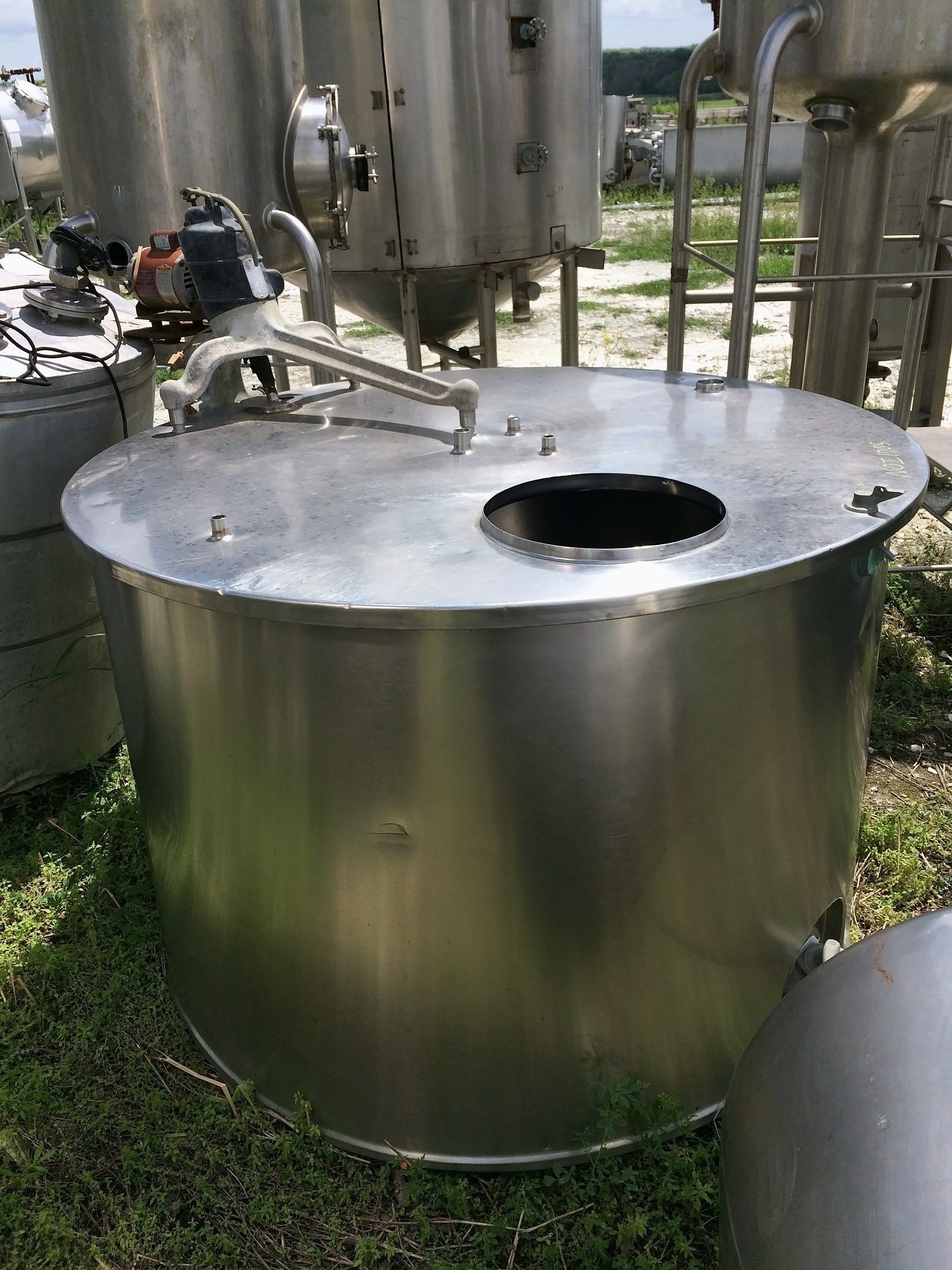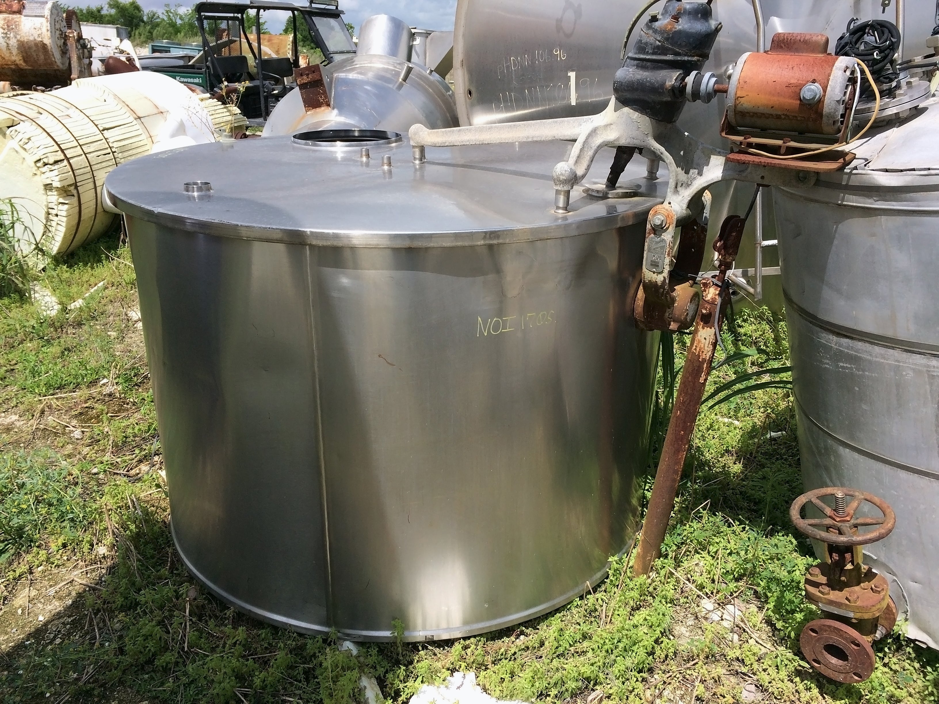 Tanque de proceso de acero inoxidable Pfaudler. Con batidora y tapa abatible. Número de pedido: E78872. Número de serie: 63164. Dimensiones internas: 54 pulgadas de diámetro x 31 pulgadas de profundidad. Drenaje: 2 pulg. Capacidad aproximada: 300 galones.
