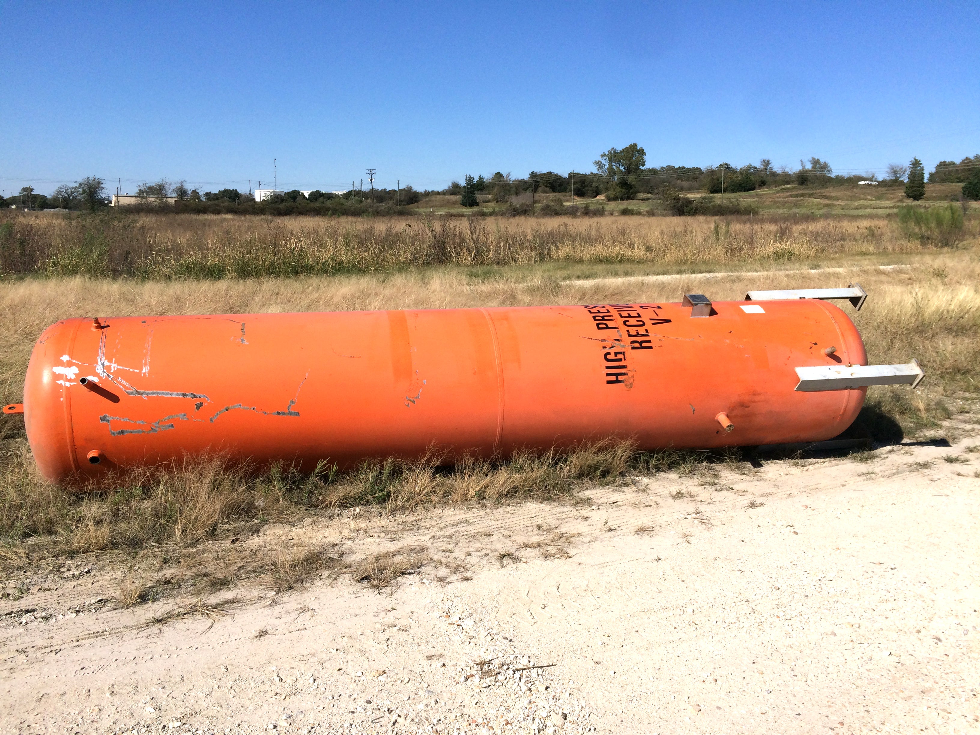 Tanque receptor vertical de amoníaco de alta presión. Certificado por EL Nickell Co., Inc. Serie: 40103. MAWP: 250 PSI a 650F. MDMT: 250 PSI a -20 °F. Volumen aproximado: 1000 galones. Dimensiones de las paredes laterales: 16 pies de alto x 42 pulgadas de diámetro.