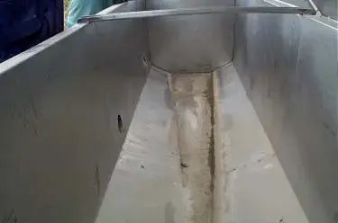 Tanque rectangular de acero inoxidable con tapas dobles. Bisagra estilo piano. Dimensiones interiores: 36 pulgadas de ancho x 116 pulgadas de largo x 30 pulgadas de alto (540 galones hasta el borde). Pendientes inferiores para desagüe ubicados en el lado derecho. Múltiples parches/soldaduras presentes. Las patas de apoyo son de acero al carbono pintado. (H)