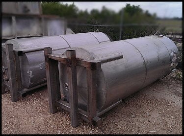 (3) Tanques de Almacenamiento Verticales de Acero Inoxidable. Dimensiones interiores: 4 pies de diámetro. x 10 pies de alto. Capacidad aproximada: 1000 galones. Cantidad disponible: 3. Características: tapas abatibles en forma de media luna, fondo cónico, salida central, entrada superior, base deslizante de tubo cuadrado. Puerto de entrada: accesorio de triple abrazadera de 1,5 pulgadas. Descarga: Brida de 4 pernos, 5 pulg. de diámetro exterior, 1 5/8 pulg. de diámetro interior. Dimensiones totales: 4 pies de largo x 4 pies de ancho x 11 pies 3 pulgadas de alto.