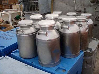 Buhl and Spartanburg Steel Products Inc. Tanques de leche: 10 galones. Dimensiones interiores de pared recta: 1 pie 1 pulgada de diámetro. x 18 pulg. H. Acero inoxidable con acabado Sanaloy. Entrada/salida: (1) 7 pulg. de diámetro. puerto. Dimensiones totales: 1 pie 1 pulgada de largo x 1 pie 1 pulgada de ancho x 2 pies de alto.