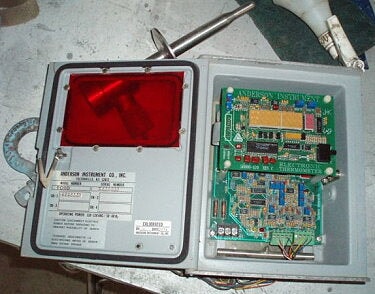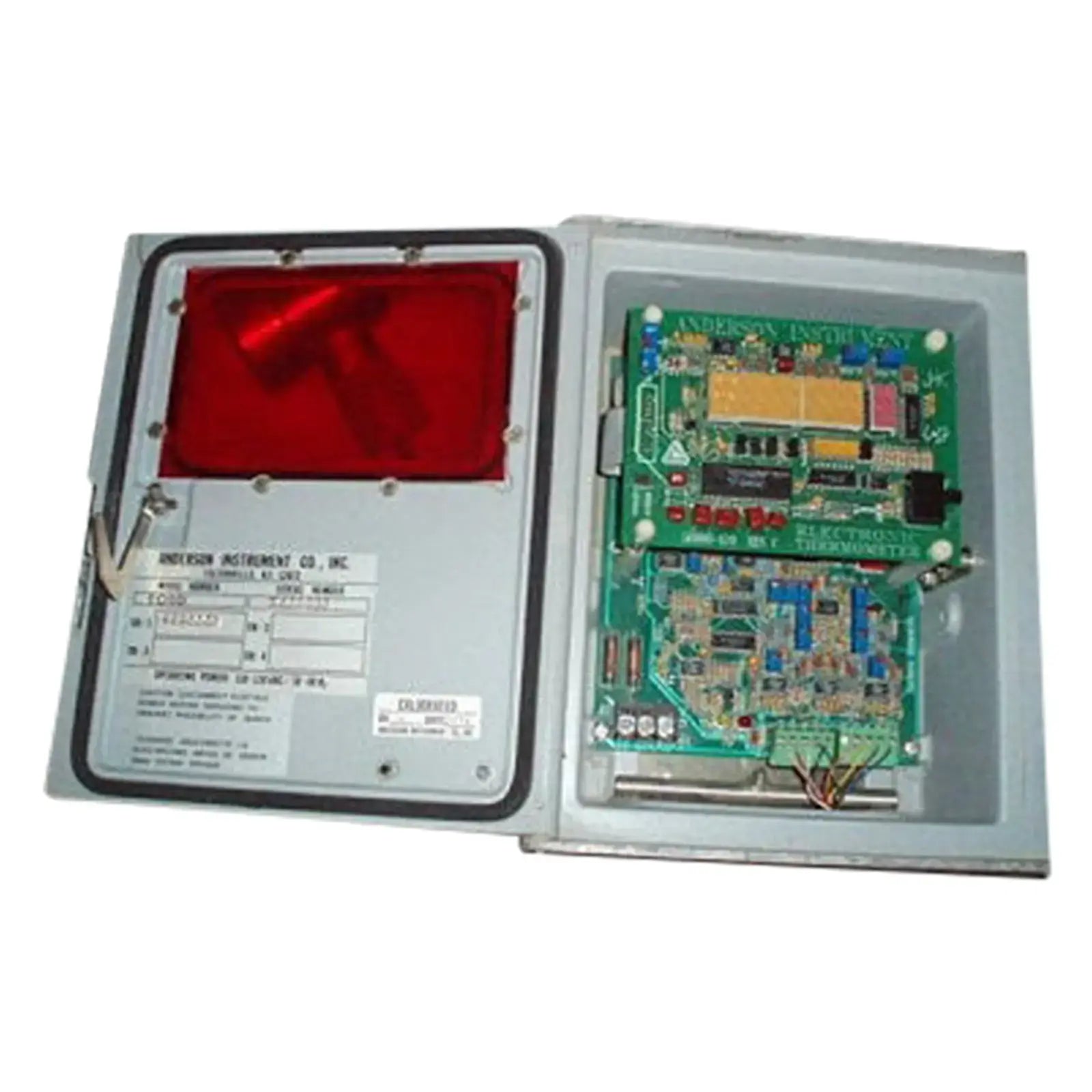Termómetro electrónico Anderson. Modelo: F0110. S/N: 9625333. Alimentación: 110-120 VAC. 50-60 Hz. Sensor de producto Anderson, S/N: 9625554. Dimensiones totales: 8 pulgadas de largo x 4 pulgadas de ancho x 10 pulgadas de alto.