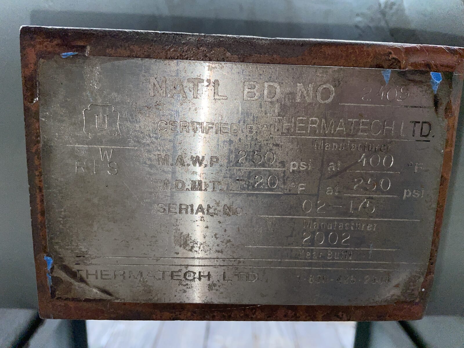 Tambor de compensación horizontal Thermatech LTD. Junta Nacional: 2409. Número de serie: 02-175. Año de construcción: 2002. MAWP: 250 PSI a 400 F. MDMT: -20 F a 250 PSI. Certificado por Thermatech LTD.