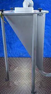 Tolva de recogida: 25 galones. Soporte de 3 patas. Capacidad de filtración. Entradas: (1) 10 pulg. de diámetro. puerto de alimentación. Salidas: (1) 2-1/2 pulg. de diámetro. Puerto de descarga. Dimensiones totales: 34 pulgadas de largo x 27 pulgadas de ancho x 51-1/2 pulgadas de alto.