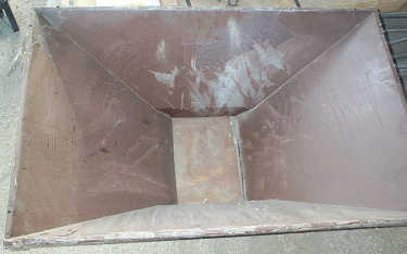 Tolva, base de 17 x 12 pulgadas, borde de 35 x 54 pulgadas, altura de 24 pulgadas.