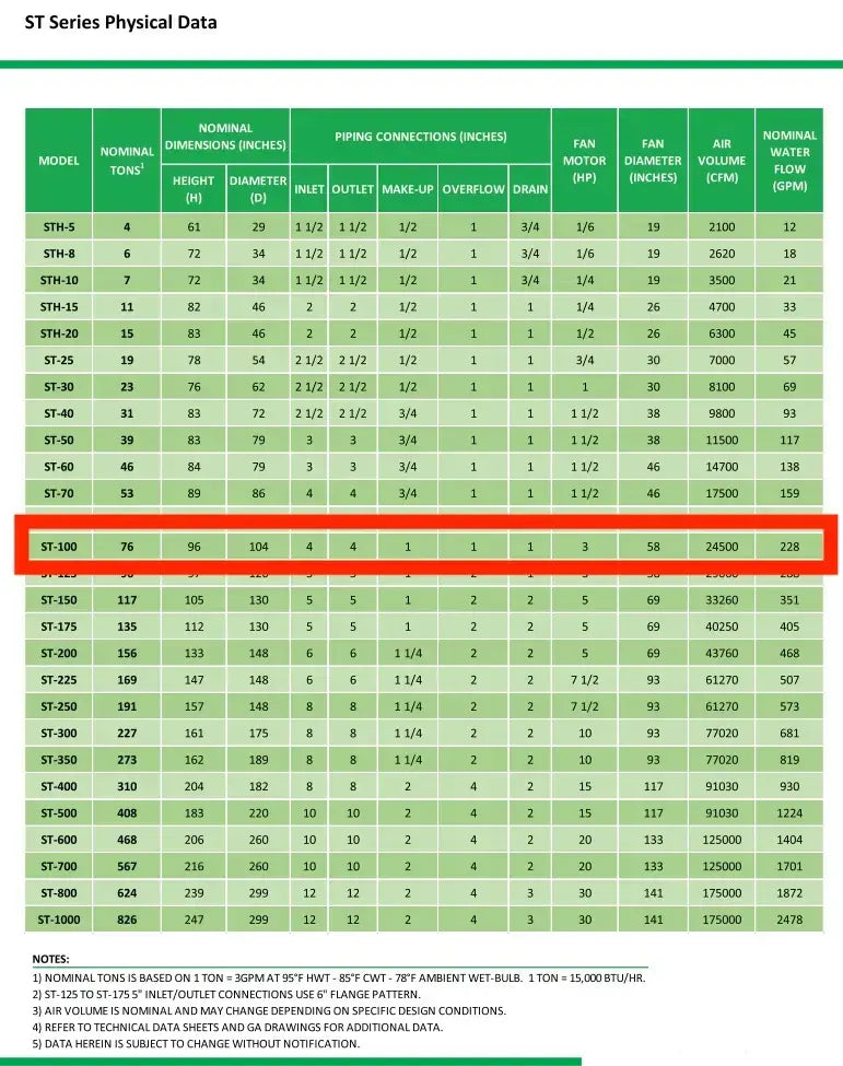 Torre de enfriamiento Amcot ST-100 (86,67 toneladas nominales, 3 HP, 208/230/460 V)