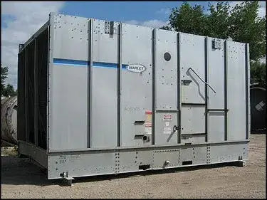 Torre de enfriamiento Marley. Modelo: NC6101GM. Clasificado para 475 toneladas o 1424 gpm a clasificaciones nominales de temperaturas de entrada y salida respectivas de 95°F y 85°F con una temperatura de bulbo húmedo de 78°F. Peso de envío 10190 libras. Dimensiones totales aproximadas: 11 pies 10-3/4 pulgadas de largo x 19 pies 10 pulgadas de ancho x 12 pies 11-5/8 pulgadas de alto (IN-ND).