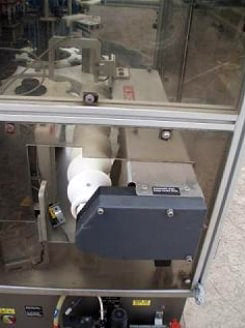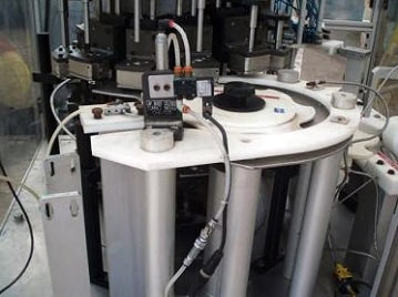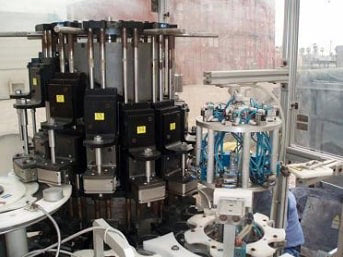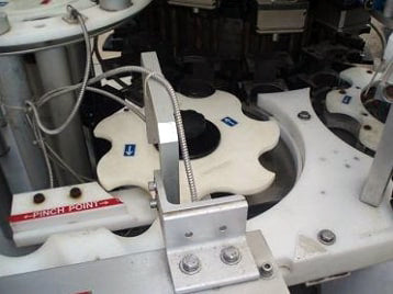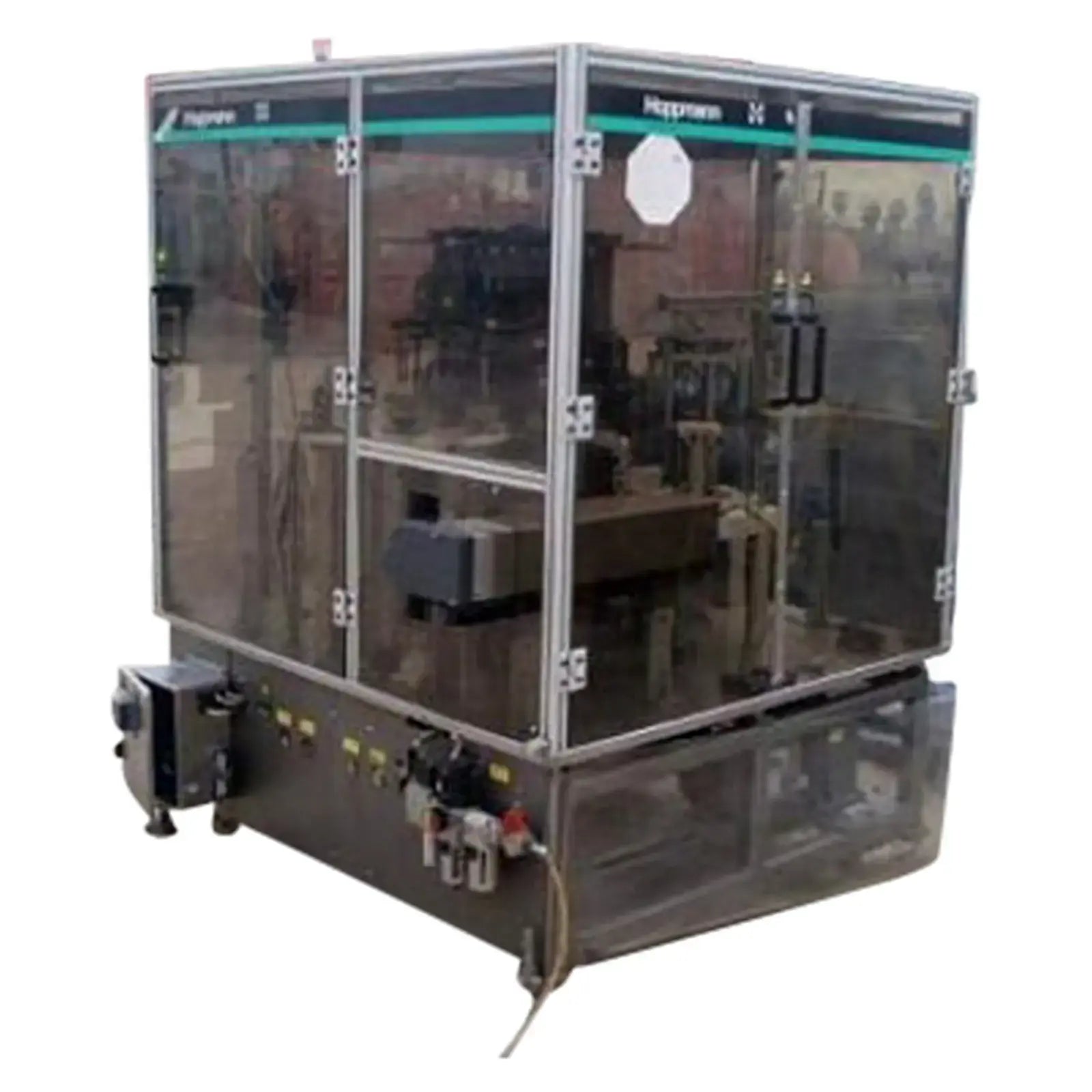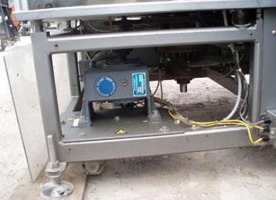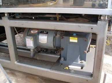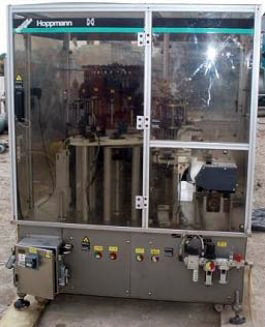 1999 Torreta giratoria Hoppmann de 14 cabezales. Modelo: CMA-24. S/N: 389740. Capacidad: 80 CPM. Funciona con aire al vacío y presión mecánica. Suministro de aire: 80 psi. Dimensiones del enchufe: 2-1/2 pulgadas de largo x 2 pulgadas de ancho. Altura máxima del contenedor: 6 pulgadas de alto. Motor eléctrico Baldor, 1 hp, 1725 rpm, 208-230/460 V, 3.6-3.4/1.7 amperios, 60 Hz, trifásico. Boston Gear Drive, relación: 40, velocidad final: 43 rpm, par de salida: 1375 in-lb. Altura de entrada/salida del transportador: 2 pies 9-1/2 pulgadas. Dimensiones totales: 5 pies 3 pulgadas de largo x 5 pies de ancho x 6 pies 2 pulgadas de alto (H17).