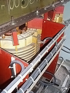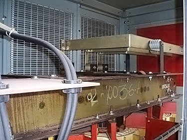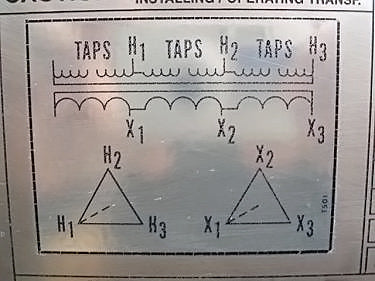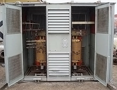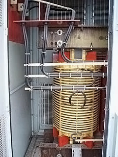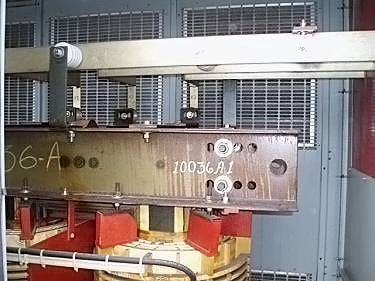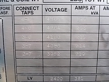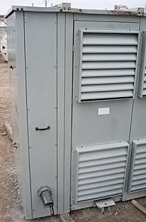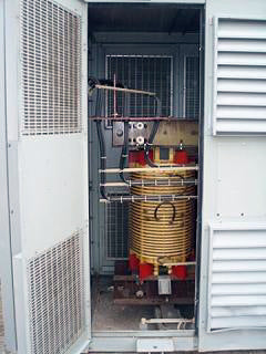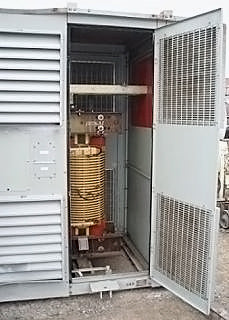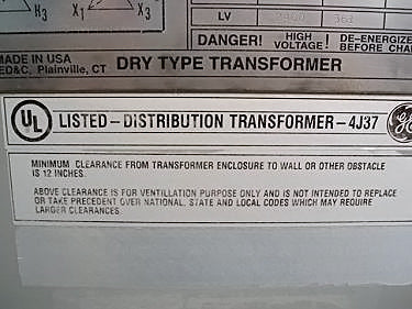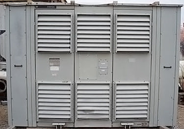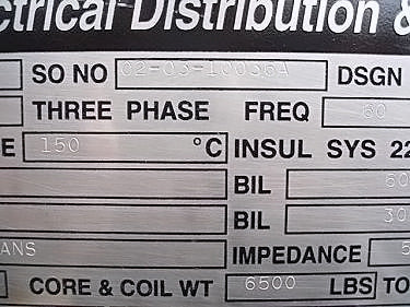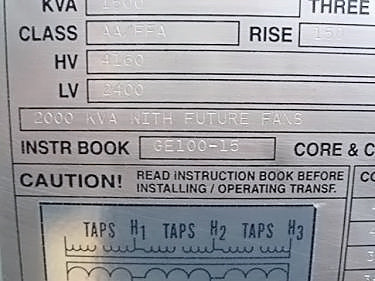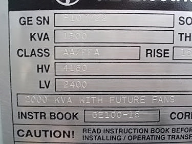 Transformador de distribución reductor tipo seco General Electric - 1500 KVA. Número de serie: P107722. SO: 02-03-10036A. Diseño: AC 374-X0180. Libro de instrucciones: GE 100-15. Listado UL No: 4J37. Alto Voltaje: 4160 V. Bajo Voltaje: 2400 V. Hercios: 60 Hz. Fase: 3 fases. Clase: AA/FFA (2000 KVA con futuros ventiladores). Subida: 302 °F (150 °C). Sistema de aislamiento: 428 °F (220 °C). Vector: DD. Tipo: HT. Impedancia: 5,57 % a 338 °F (170 °C). Peso del núcleo y la bobina: 6500 lbs. Peso total de la unidad: 9000 libras. Instalado originalmente en la planta de Tropicana. Dimensiones totales: 11 pies 6 pulgadas de largo x 4 pies 8 pulgadas de ancho x 7 pies 8 pulgadas de alto (ACN1566).
