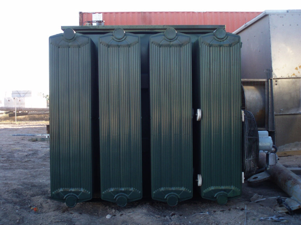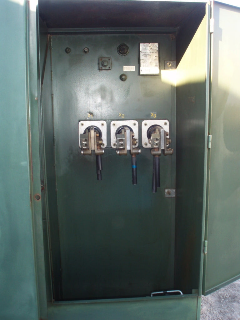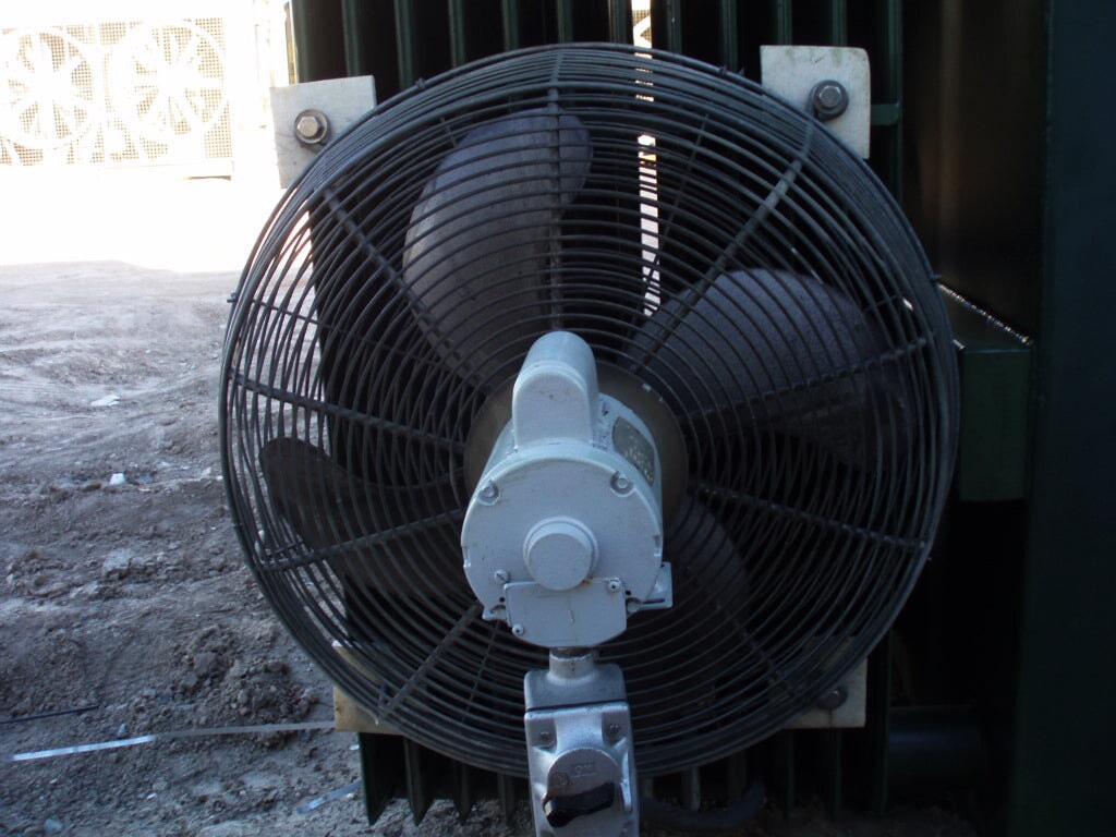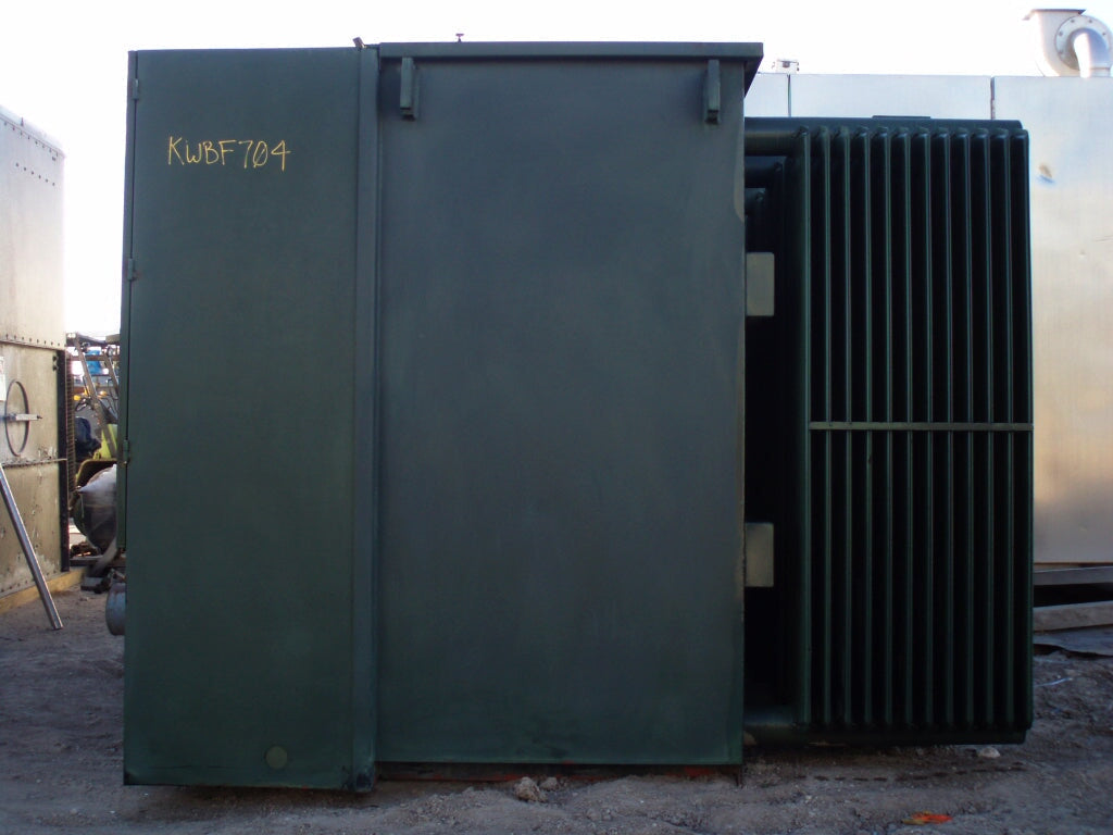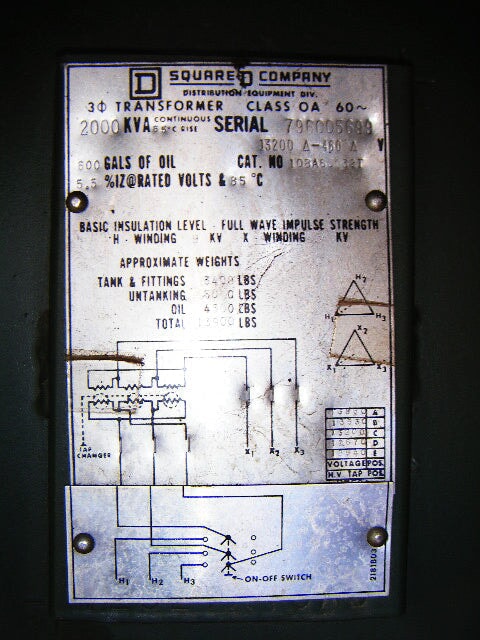 Transformador de la empresa Square D. Alta tensión: 12.470. Baja Tensión: 460. KVA: 2.000. Hercios: 60. Fase: 3. OA de clase alta. Aislamiento: Nivel de aislamiento básico: resistencia al impulso de onda completa. Impedancia: 5,5 % IZ a voltios nominales y 185 °F (85 °C). Capacidad de aceite: 600 galones. Diámetro del ventilador: Motor de ventilador Leeson de 2 pies y 1 pulgada, 0,5 hp, 1750 rpm, 115 V. Peso total: 13,900 lbs. Dimensiones totales: 7 pies 11 pulgadas de largo x 7 pies 10 pulgadas de ancho x 7 pies 2 pulgadas de alto (ACN525).