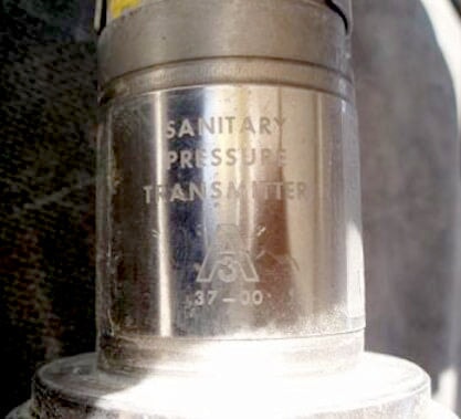Transmisor de presión sanitaria Viatran Corporation. Modelo: 3515AP6AT560. S/N: 11338620. Rango: 0-200 psig. Presión de calibración: 39,88 psig. Presión máxima: 300 psig. Máx. voltios: 40. Dimensiones totales: 2-1/2 pulgadas de largo x 2-1/2 pulgadas de ancho x 9 pulgadas de alto.