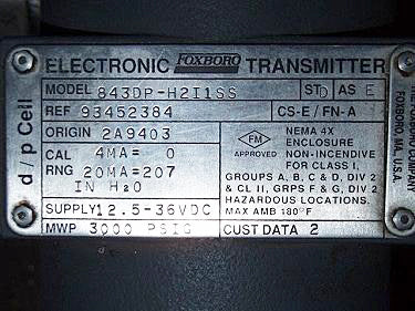 Transmisor electrónico de presión diferencial Foxboro. Modelo: 843DP-H2I1SS. S/N: 93452380. Presión máxima de trabajo: 3000 psi. Cal: 4MA=0 (H2O). Rango de medición: 20MA=207 (H2O). St: D. AS: E. Tensión de alimentación: 12,5-36 VDC. Caja Nema 4X. Entradas: (1) 3 pulg. de diámetro. Conexión de línea S. Dimensiones totales: 8 pulgadas de largo x 5 pulgadas de ancho x 6-1/2 pulgadas de alto.