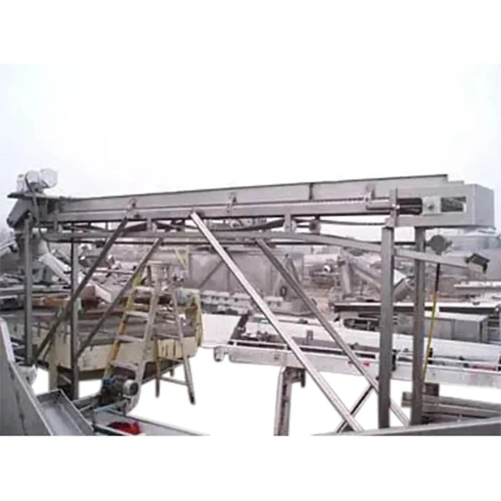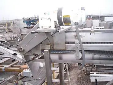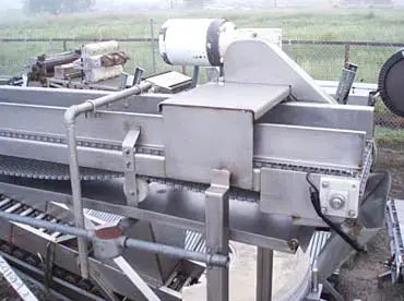 Transportador de banda de acero inoxidable. Ancho de la correa: 1 pie. Apertura/espacio libre máximo sobre la correa: 10 pulg. de ancho x 2-1/2 pulg. de alto. Motor eléctrico Baldor, 1/2 hp, 1725 rpm, 208-230/460 V, 1.8-1.6/ 0,8 amperios, 60 Hz, trifásico. Reductor de velocidad Boston Gear, relación: 30, velocidad final: 57,5 rpm. Altura de entrada/salida del transportador: 7 pies. Dimensiones totales: 13 pies 2 pulgadas de largo x 4 pies de ancho x 8 pies 3 pulgadas de alto.