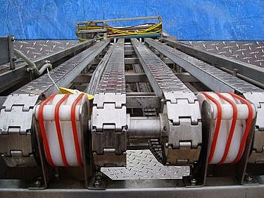 2001 Cinta transportadora Raque de acero inoxidable. Modelo: M-4366-00-01. S/N: 1010051. (4) cinturones de 2-3/4 pulgadas de ancho. Anteriormente utilizado para transportar pasteles de 8, 9 y 10 pulgadas de diámetro. Alimentación: 460 V, 60 Hz, trifásica. Corriente a plena carga: 4 amperios. Corto máximo: 15 amperios. Carga más grande: 2 amperios. Panel de control Allen-Bradley. Entrada/salida: 34-1/2 pulgadas de alto. (2) motores eléctricos de acero inoxidable Sterling, 1 hp, 1720 rpm, 208-230/460 V, 3,30/1,65 amperios, 60 Hz, trifásicos. (2) Flex-Inline, relación: 10, 172 rpm (final). Dimensiones totales: 9 pies 2-1/2 pulgadas de largo x 41-1/2 pulgadas de ancho x 40 pulgadas de alto.