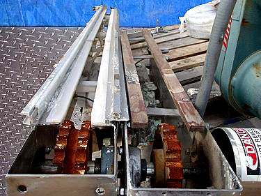 Transportador de mesa en tándem de acero inoxidable. Transportador 1: Tamaño máximo de la correa manejada: 4-1/2 pulg. W. Espacio de recorrido para el transportador: 1-1/2 pulg. Diámetro de la rueda dentada: 6 pulg. Paso: 3/4 pulg. Transportador 2: Tamaño máximo de la correa manejada: 4-1/2 pulg. W. Espacio de funcionamiento para el transportador: 2-1/4 pulg. Diámetro de la rueda dentada: 6 pulg. Paso: 1-1/2 pulg. Motor eléctrico Reliance, 1-1/2 hp, 1725 rpm, 208-230/460-480 V, 5,6-5,6/2,8-3,0 amperios, 60 Hz, trifásico. Variador de velocidad ultra ajustable Reeves, tamaño: 1B16, 62/7,7 rpm (máx./mín.). Dimensiones totales: 93 pulgadas de largo x 26 pulgadas de ancho x 25-1/2 pulgadas de alto.