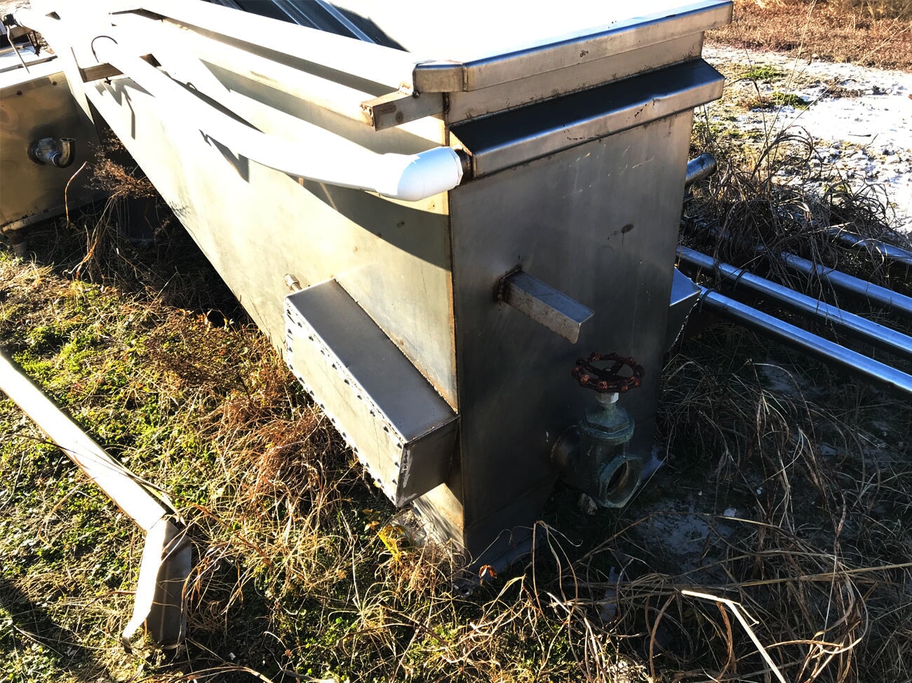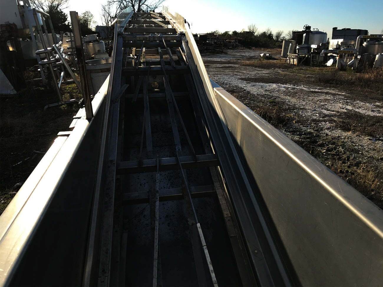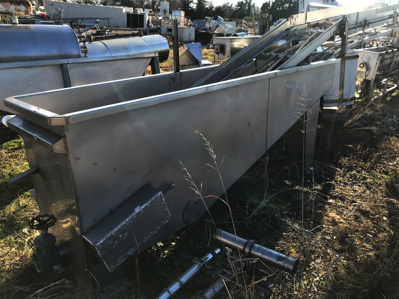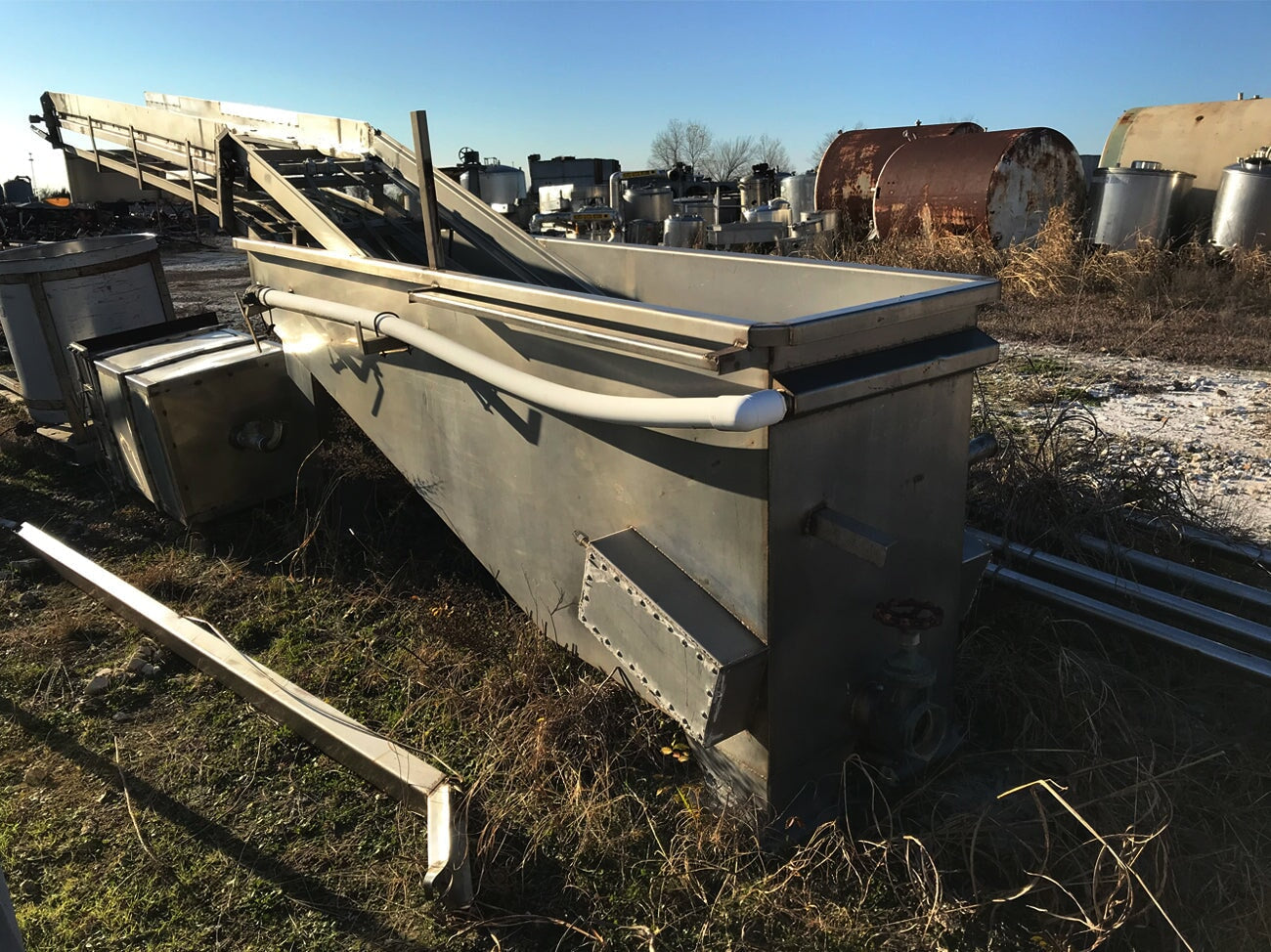 Transportador elevado con tanque de lavado: 320 galones. Apertura/espacio libre máximo sobre la cinta: 24 pulgadas de ancho x 3 pulgadas de alto. Ancho del transportador: 24 pulgadas. Altura a la salida del transportador: 80 pulgadas. El tanque de lavado está equipado con un puente rociador. Dimensiones del pulverizador: 1-1/4 pulg. de largo x 3/16 pulg. de ancho. Entradas: (1) 2 pulg. de diámetro. Línea de alimentación de puente rociador de PVC, (1) 3-1/2 pulg. de diámetro. (tanque). Salidas: (1) 4 pulg. de diámetro. NPT (válvula hembra). Dimensiones totales: 23 pies 9 pulgadas de largo x 36 pulgadas de ancho x 83 pulgadas de alto.