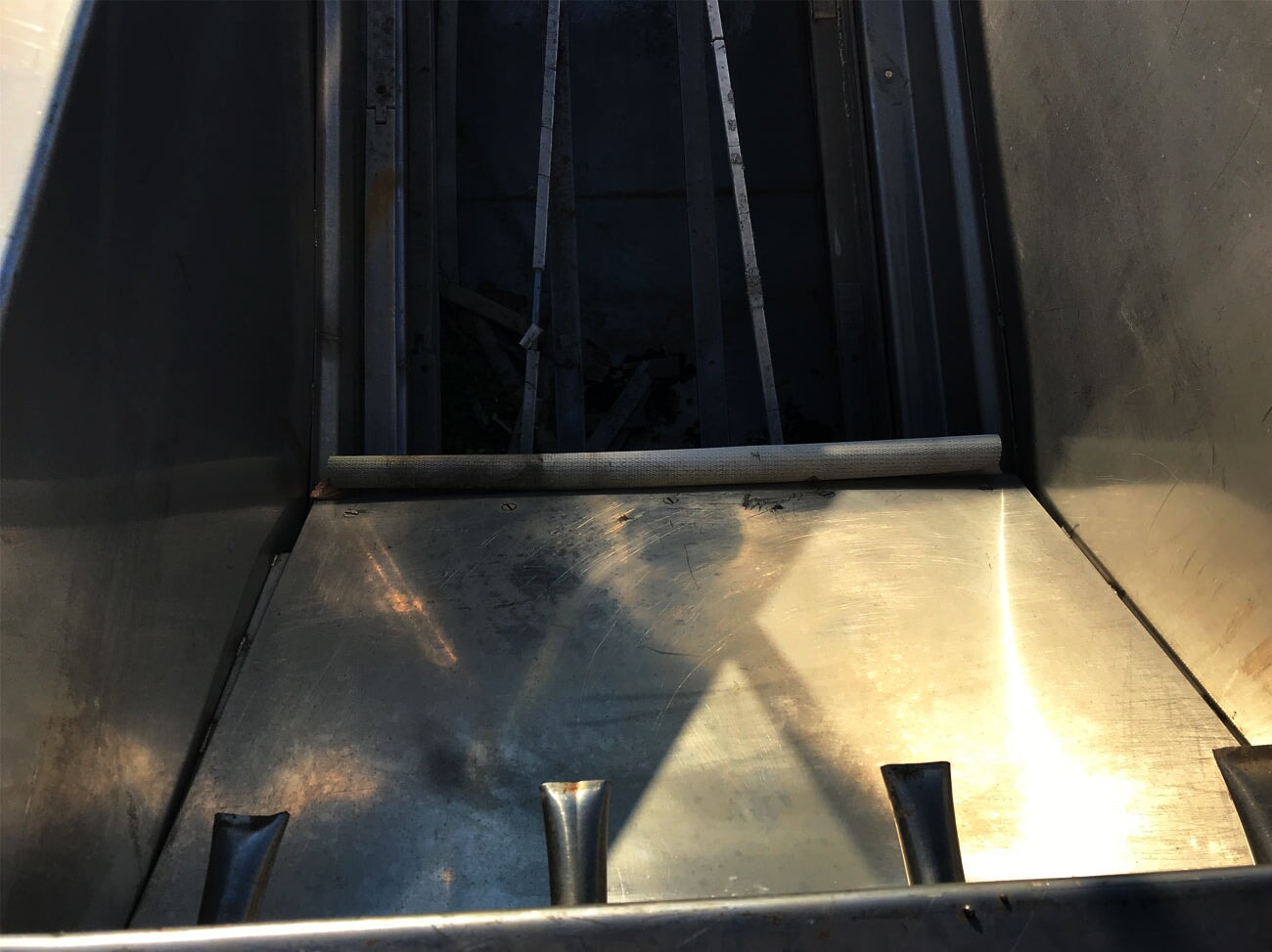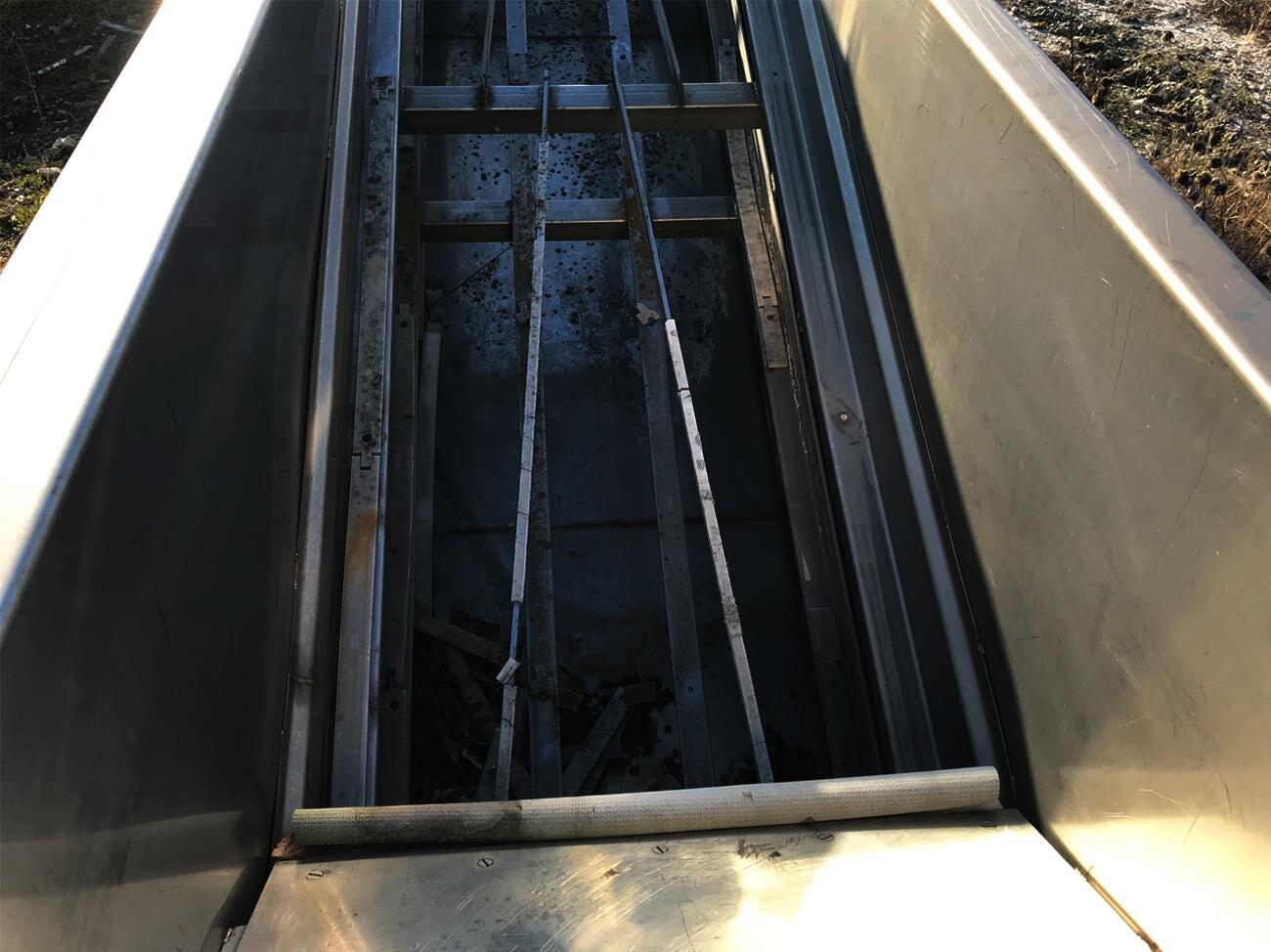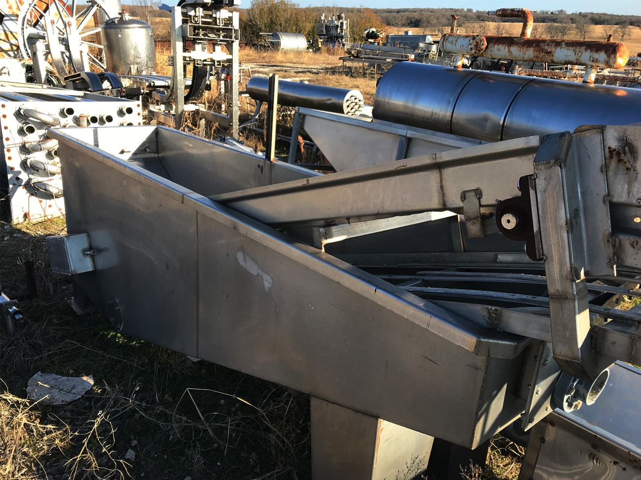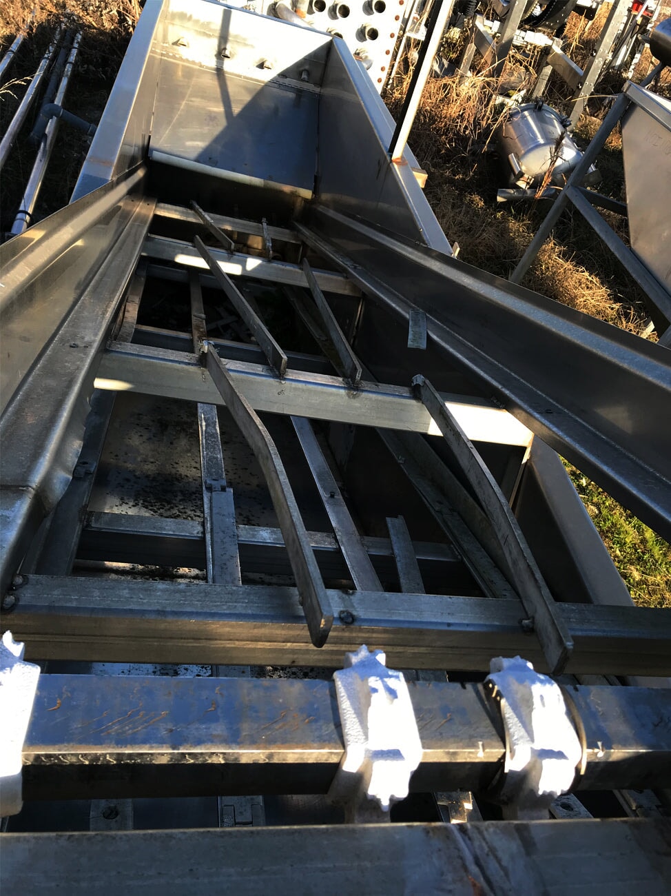 Transportador elevado con tanque de lavado: 320 galones. Apertura/espacio libre máximo sobre la cinta: 24 pulgadas de ancho x 3 pulgadas de alto. Ancho del transportador: 24 pulgadas. Altura a la salida del transportador: 80 pulgadas. El tanque de lavado está equipado con un puente rociador. Dimensiones del pulverizador: 1-1/4 pulg. de largo x 3/16 pulg. de ancho. Entradas: (1) 2 pulg. de diámetro. Línea de alimentación de puente rociador de PVC, (1) 3-1/2 pulg. de diámetro. (tanque). Salidas: (1) 4 pulg. de diámetro. NPT (válvula hembra). Dimensiones totales: 23 pies 9 pulgadas de largo x 36 pulgadas de ancho x 83 pulgadas de alto.