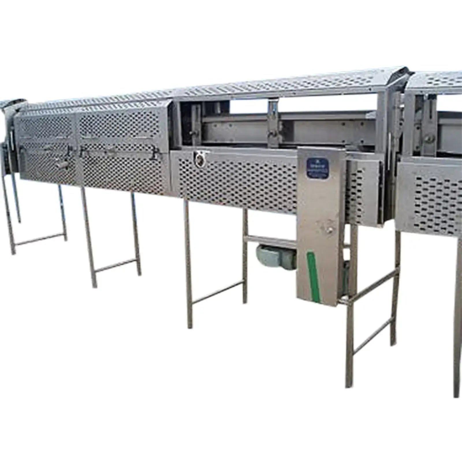 Transportador esterilizador de tarros Nercon, cadena TT de 4-1/2, secciones cubiertas (1) Sección recta de 54 pulgadas de largo (2) Secciones de 12 de largo con transición de 54 pulgadas de largo (solo una tiene unidad motriz) (1) Sección de 54 pulgadas. de largo más curva de 45 grados. Se incluyen soportes para patas, rieles de soporte y rieles laterales. Cadena TT no incluida, faltan varias tapas. Este transportador fue diseñado y construido para inyectar vapor vivo en frascos llenos de producto a medida que se transportan fuera de la llenadora. Estas secciones son NUEVAS, nunca utilizadas.